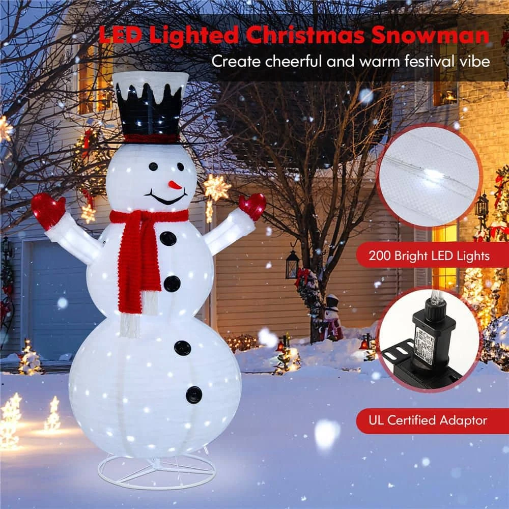 Accompany You and Your Family to Have a Wonderful Christmas u003cbr> Our 6 ft. pop-up lighted Christmas snowman is perfect for winter decoration, Christmas Eve events, and wonderland-themed parties, adding charm and joy to your holiday. It is decorated with a gentleman’s hat, a cute nose, a chic red scarf, red gloves, and black summarys, which add a happy ambiance for your holiday time. Moreover, there exist 200 cool-white LED lights to enhance nighttime visibility while bringing a beautiful festival glow. Thanks to the pop-up design, our artificial Christmas tree is easy to set up, all you need to do is connect the upper rod to the lower rod, then pull up the snowman and hook up the bottom rings and hooks for fixation. Also, it can be folded into a compact size for convenient storage when not in use. Besides, this pre-lit Christmas decoration features IP44 waterproof rating, which can be a perfect addition to any indoor and outdoor area.