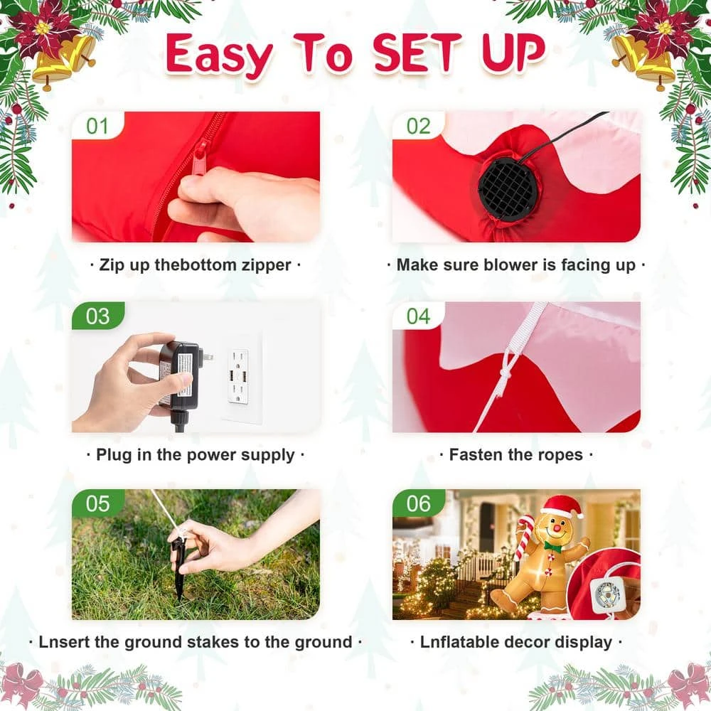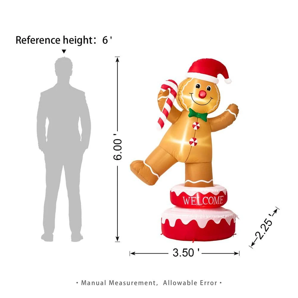 Decorate your yard for Christmas with this 360° auto-rotate Gingerbread Man inflatable decor. Holds candy cane and wears Christmas hat, this Gingerbread man is smiling and waving to you. Designed with ultra-durable, weather-resistant polyester and featuring internal white LED glow, this holiday decor will create a festive focal point in your yard.