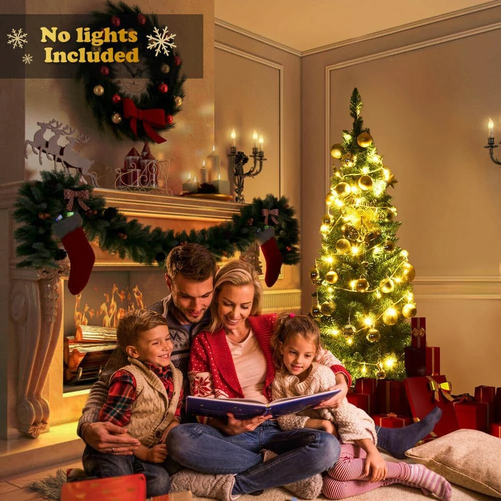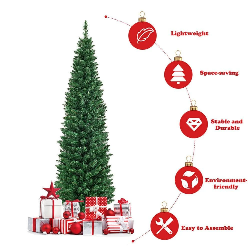 Our new Artificial Christmas tree features slim pencil design, which is great for display in corners, small rooms and areas with limited floor space. It features simple green color, 400 branch tips design to help emulate a real Christmas tree. The tree is made of fade and crush resistant PVC needles, appears fresh-cut. In addition the staggered branches give the tree a fuller profile. High density metal bases to keep the tree planted in an upright position. Our tree adds a touch of nature to your home year-round. Warning: Please remove the plastic cap which is useless before installation. If damaged or missing when received, not impact any usage effect.