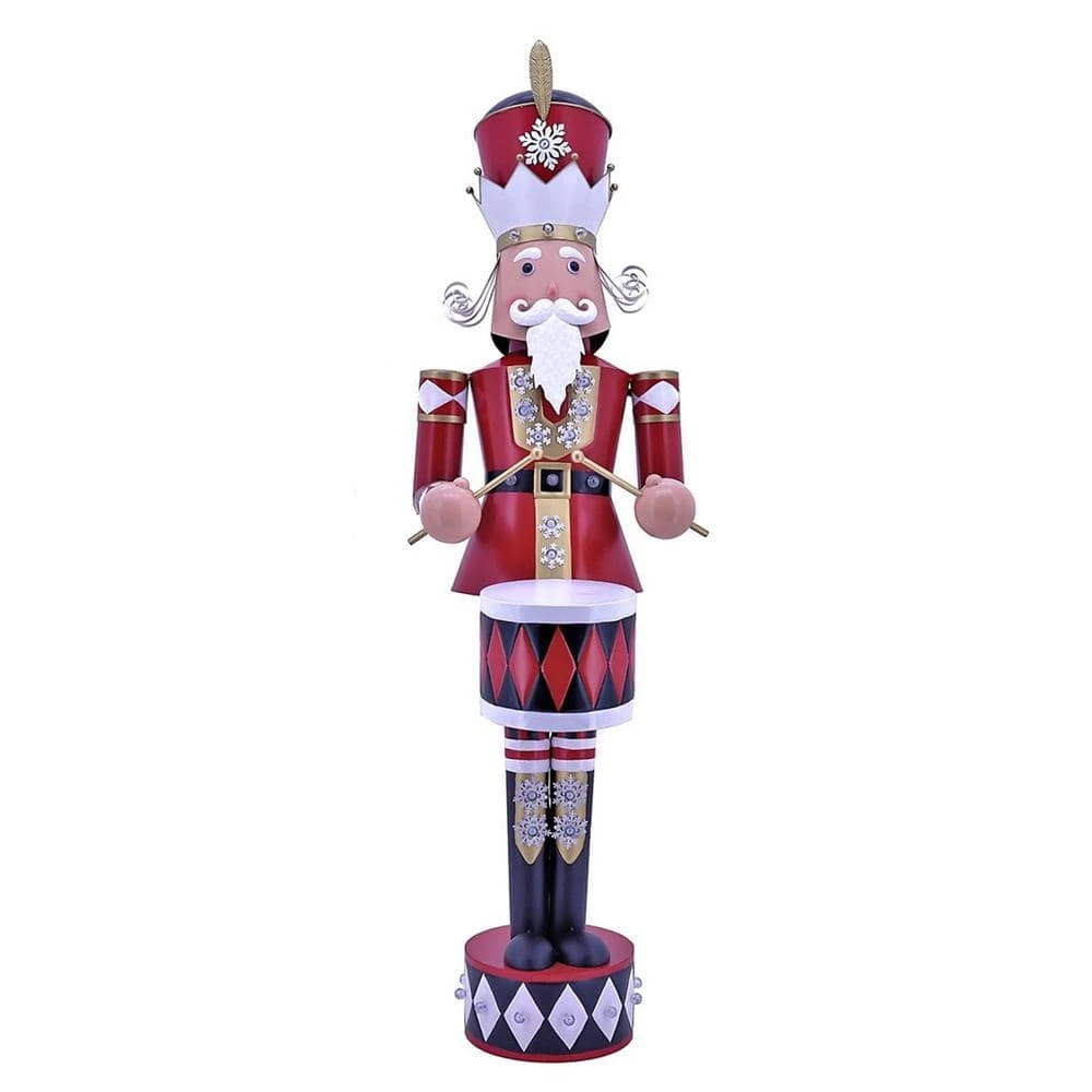 Make an impact this Christmas with George our Large Iron Nutcracker with Drums. George is expertly crafted from powder coated iron for a sturdy and durable frame. He has been hand painted in a glossy finish with special attention to details like his snowflake summarys and white LED bulbs are spread throughout his body, adding an extra-flair.