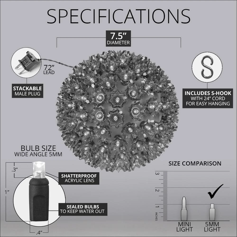 There’s no easier way to brighten your holidays, parties, weddings and outdoor landscapes than with these LED starlight spheres from Wintergreen Lighting. Just hang them, plug them in and you have instant, brilliant orbs of light. Each sphere is embedded with 5 mm 120 LED mini lights. Each light is encased in a plastic floral-shaped housing that enhances the light and helps keeps bulbs protected during installation and display. The 6 ft. lead cord is ideal for hanging. Plus, LED bulbs make these spheres energy efficient and built to last. Mix colors for a fun, festive display that’s uniquely you.