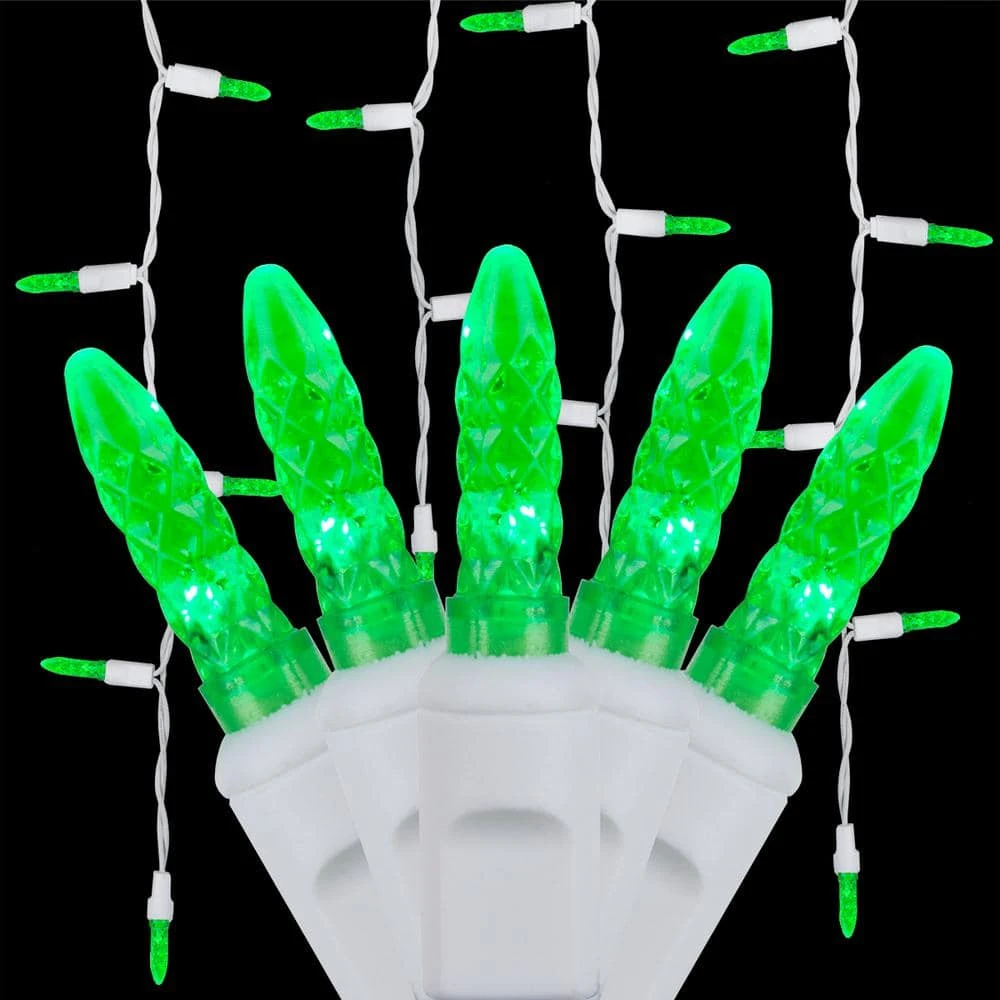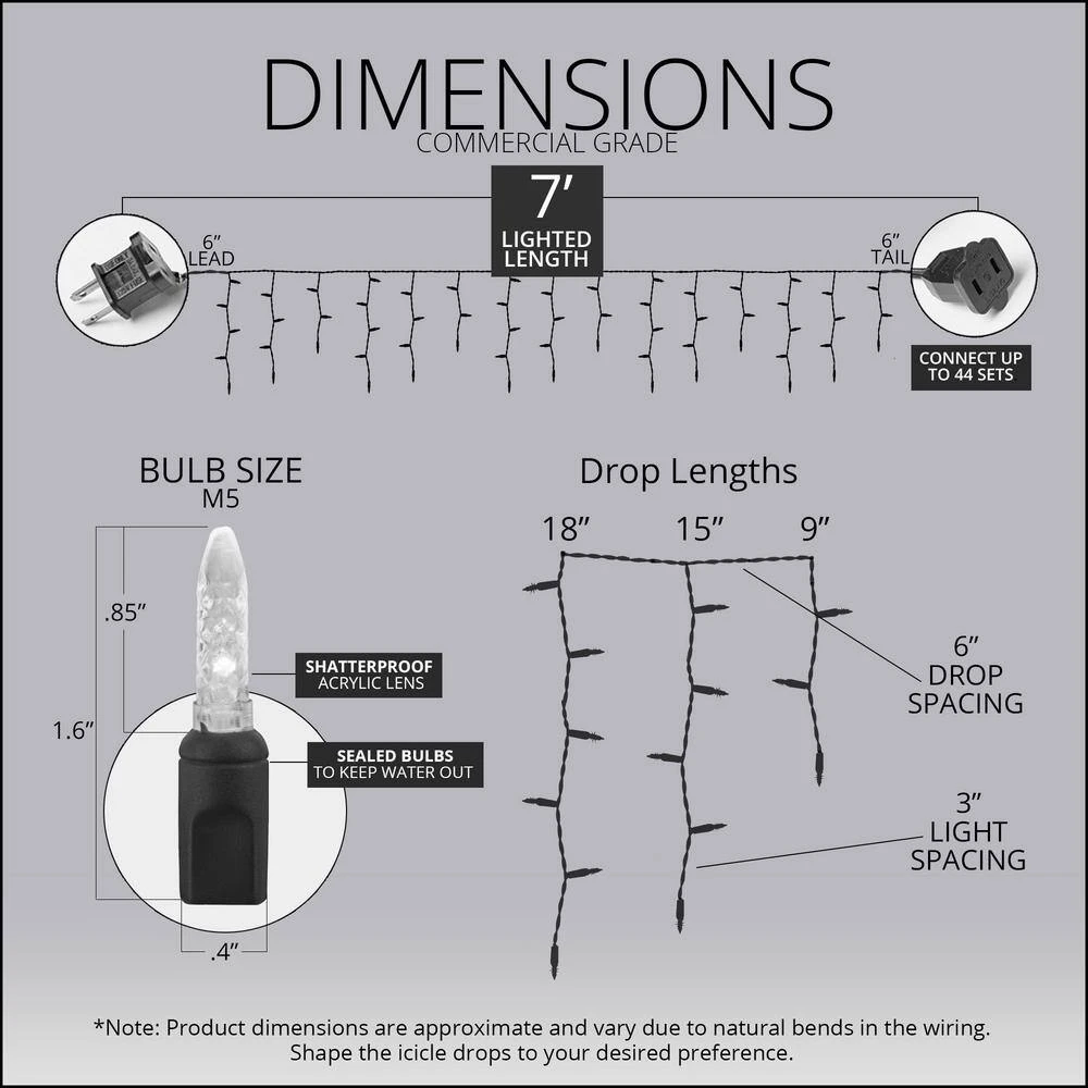 - 70 green M5 LED icicle lights on white wire, 15 vertical drops in lengths of 18 in., 15 in. and 9 in., approx.7 ft. lighted string length