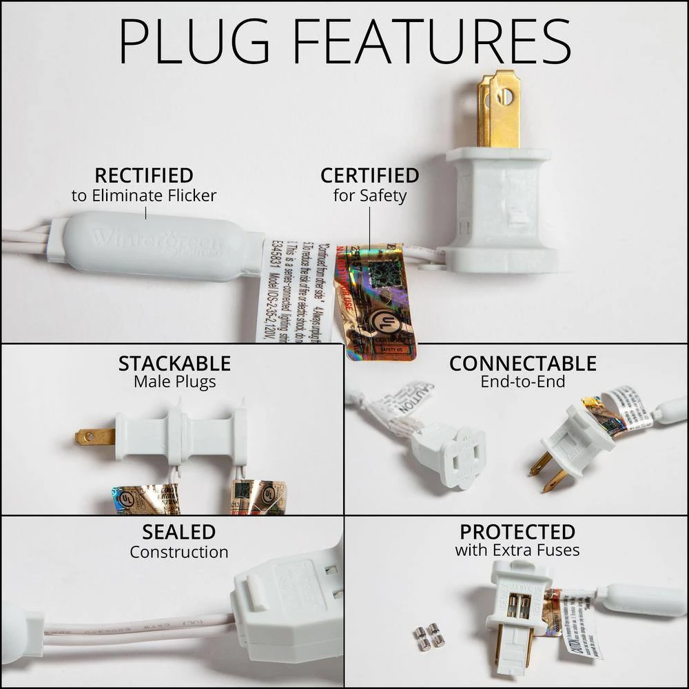 - 6 in. lead with 120-Volt fused male plug, 6 in. tail with female plug for end to end connections
