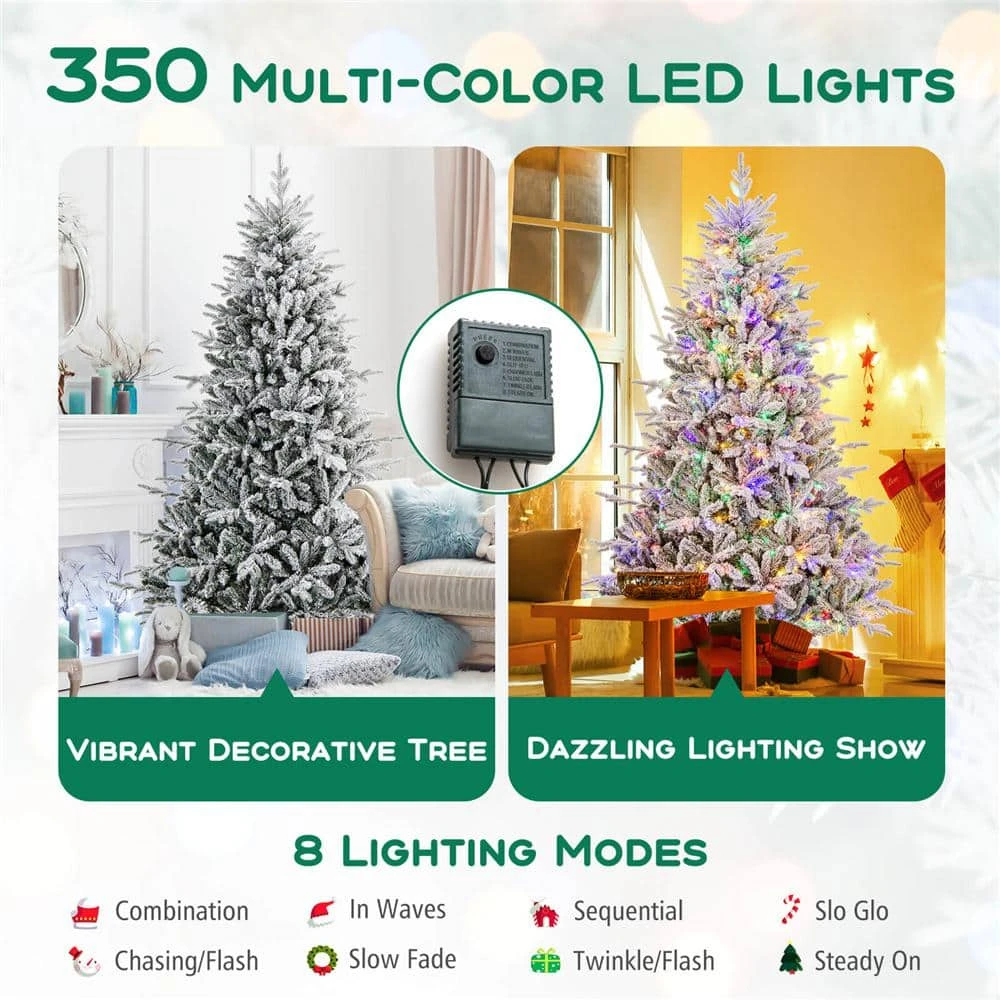 Create a festive atmosphere with the 7 ft Xmas tree, featuring 350 LED lights and a flocked design. Enjoy 8 lighting modes to match any occasion, including chasing/flash, slow fade, twinkle/flash, steady on, and more. Crafted from premium PVC and PE materials, this 3-section Christmas tree is fireproof, non-allergic, anti-fading, and smell-free. With 1164 branch tips, it exudes a lush and inviting look that suits any setting. Quickly transform your space with a simple assembly tree, thanks to its hinged structure and foldable stand. Trust in its safety with the UL-certified adaptor, making it a worry-free centerpiece for your holiday decoration. A Christmas tree designed for seamless integration and holiday harmony. Merry Christmas!