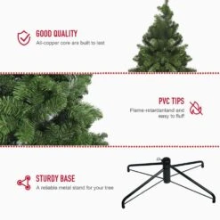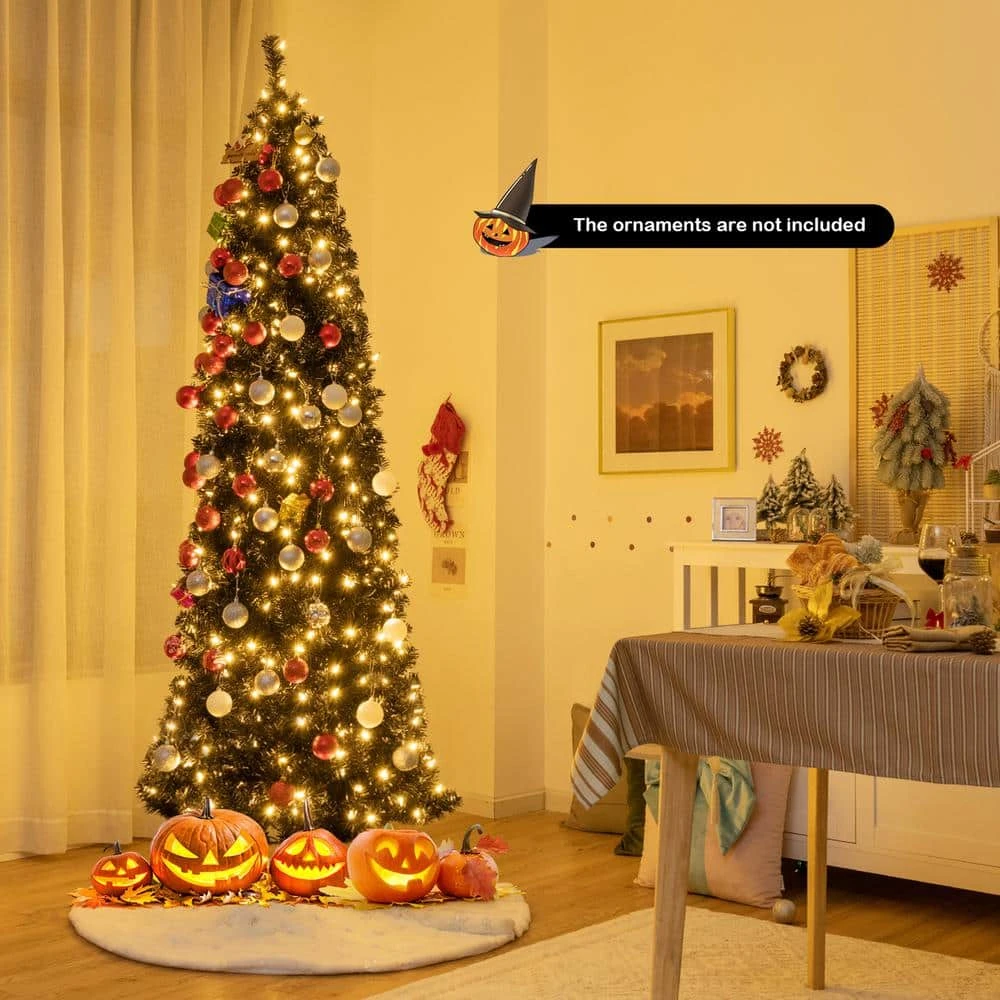 This 7 feet tall black Christmas tree provides you with more using choices. It’s able to match various party themes, such as Christmas and Halloween party. It can always bring a strong festive and pleasant tone to you. Featuring about 818 branch tips, this slim pencil tree provides a lush, full and natural appearance. You can add extra ornaments on the tree with your family members to customize your dreamed tree. and it comes with 350 pre-strung warm white LED lights to make itself more attractive in the evening. If 1 bulb is burnt out, you can replace it with spare bulbs which come with the package. Made of 100% new PVC, this Christmas tree with hinged structure can serve for you for years to come.