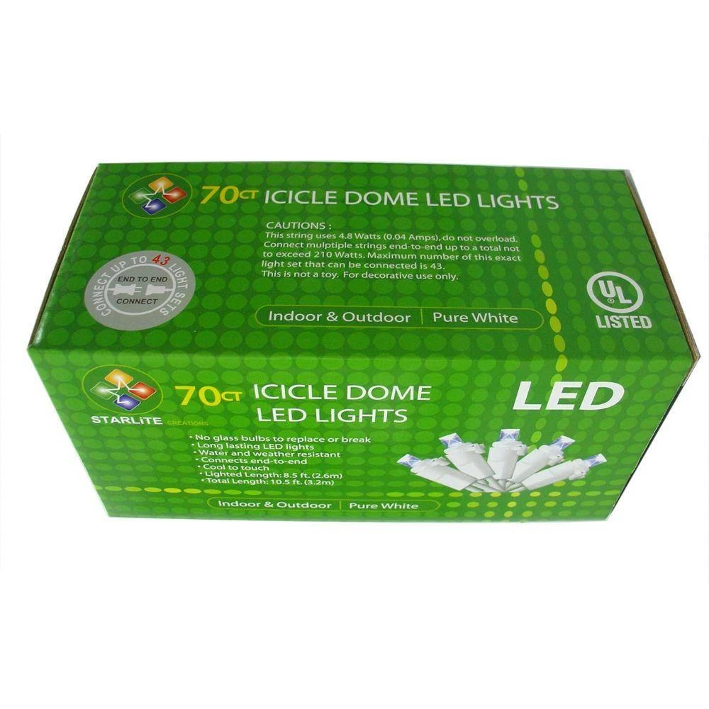 Decorate your Christmas and holiday celebrations with the Starlite Creations 70-Light LED Cold White Dome Icicle Light Set. The dome design reflects light in all directions, so it offers a brighter shine. Connect up to 43 sets to create up to 450 ft. of string lights with more than 3000 LEDs.