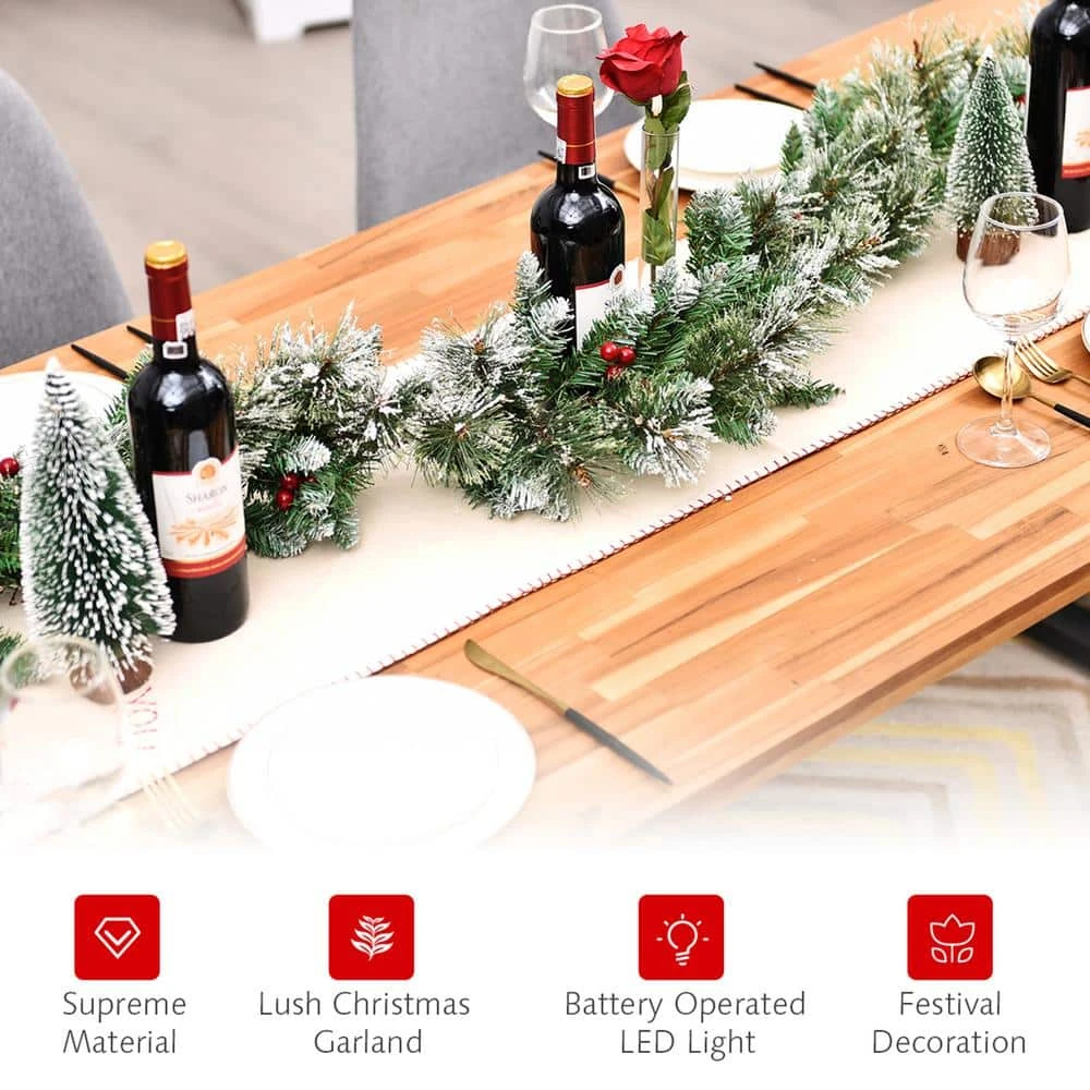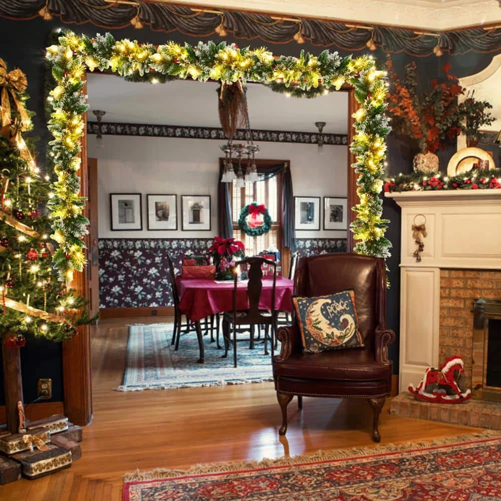 Warm hearted wishes for an old fashioned Christmas and a happy new year filled with all your favorite things. This is our 9 ft. pre-lit garland for Christmas decoration, which can add great fun to your holiday. This beautiful decorative rattan is made of 100% new PVC and has fascinating Winter details, including red berries and snow flocked tips. It comes with 50 warm white LED lights and a battery powered timer. After the power supply is switched on, the soft light will brighten the Christmas night. This rattan can be perfectly placed on the table, fireplace and anywhere you want to create a Christmas atmosphere. It can build an incredible festival party and bring a happy Winter bless.