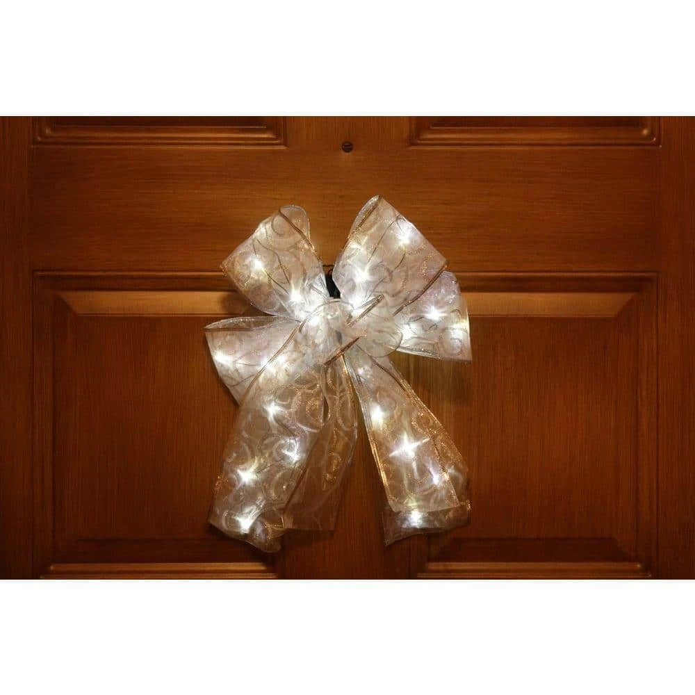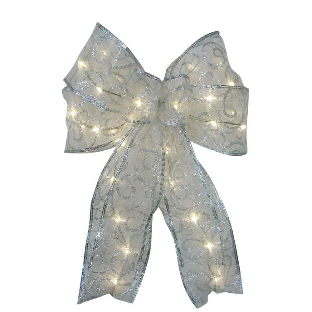 Add a festive touch to your Christmas tree or gift wrapping with this White LED Light Bow. The white-colored bow has 36-LED lights embedded into its fabric, resulting in a creative decorating element for display nearly anywhere. Unique wire flexibility can be twisted into whatever shape you need desire to display on railing, packages and more.
