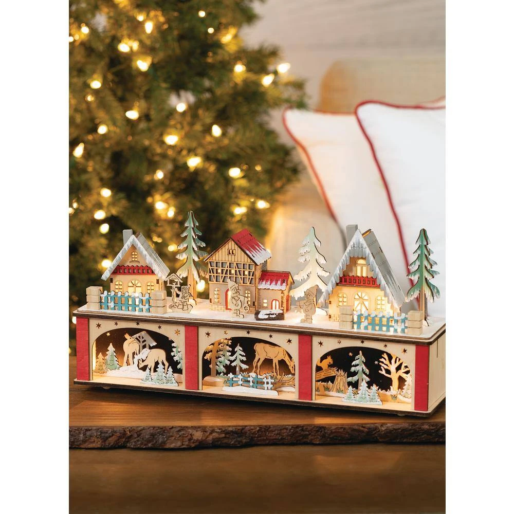 - Add a holiday touch to your shelf or table with this wooden village scene