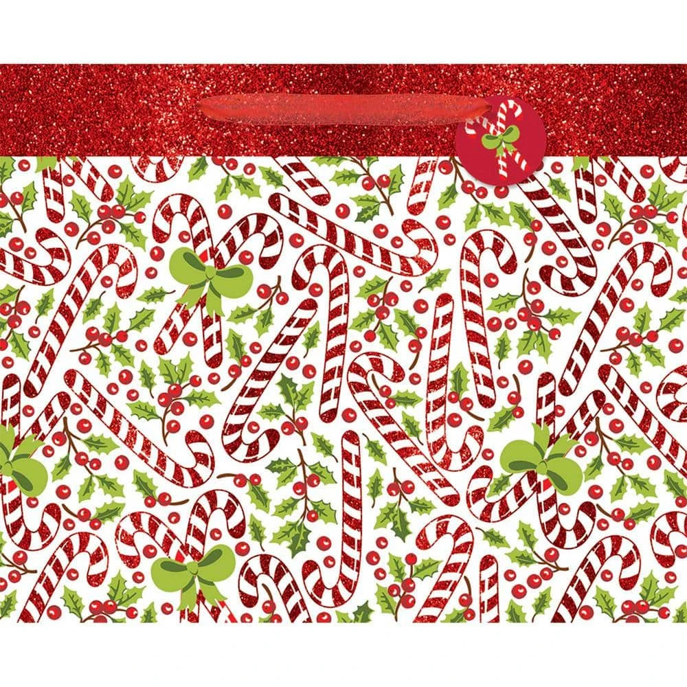 Christmas is a time for giving gifts to your loved ones. Dress up your presents with these Red and White Candy Cane Extra Large Horizontal Bags with Gift Tags. Each glittery bag features an all over print of red and white striped candy canes, holly, and berries. Every bag has a handle to make carrying and gift giving easy.