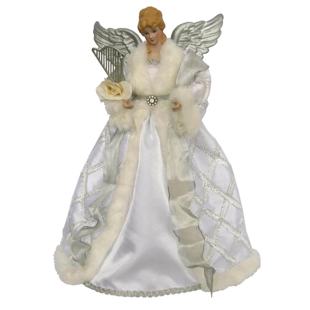 This angel is beautiful. She is dressed in silver trimmed with white faux fur and silver ribbons. Her coat has a diamond design accented with sparkles. She is holding a silver harp and her wings are silver which compliment her perfectly. She is would look gorgeous on any tree.