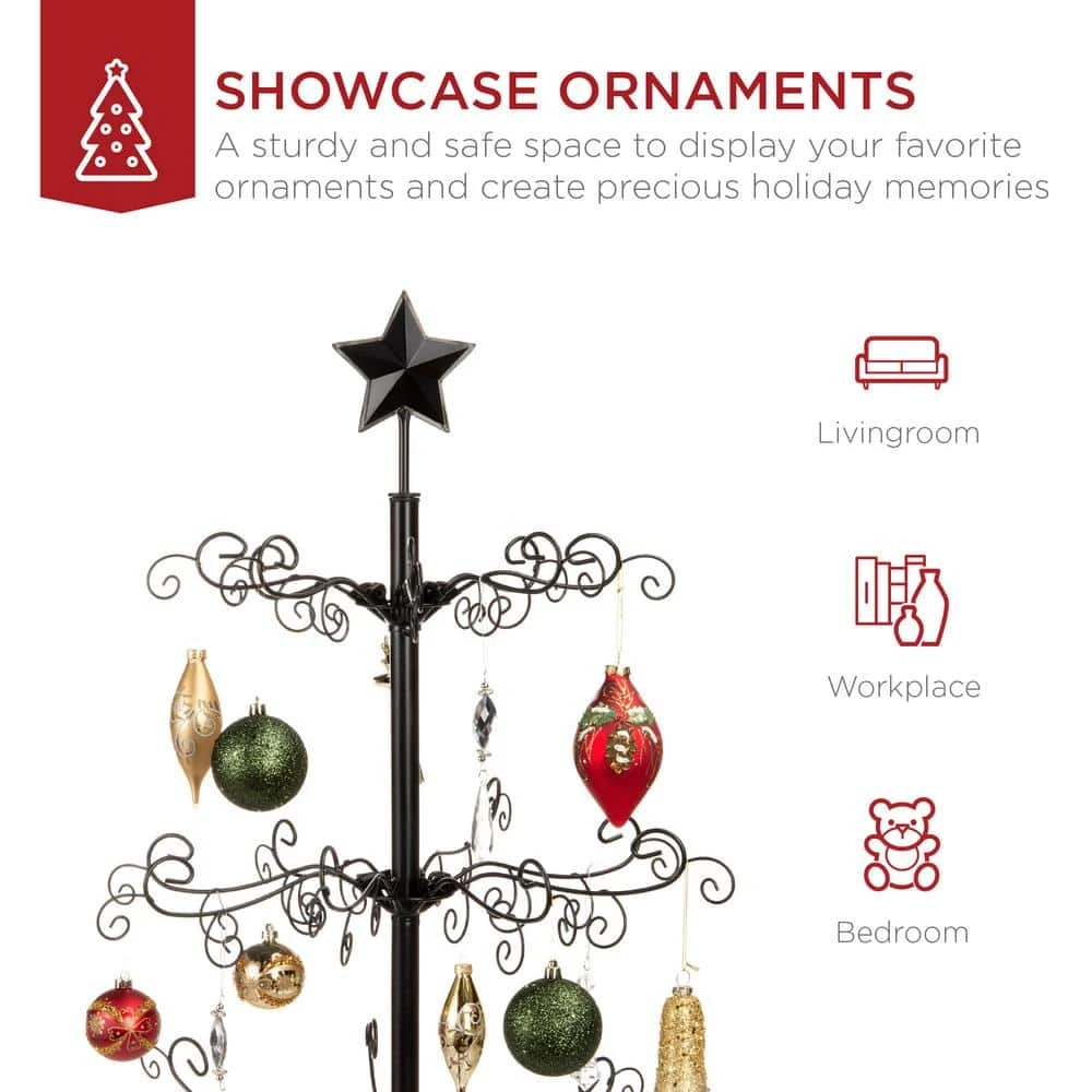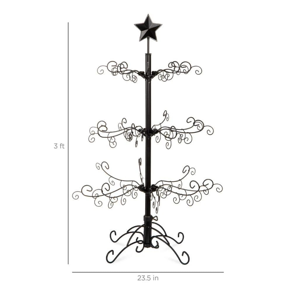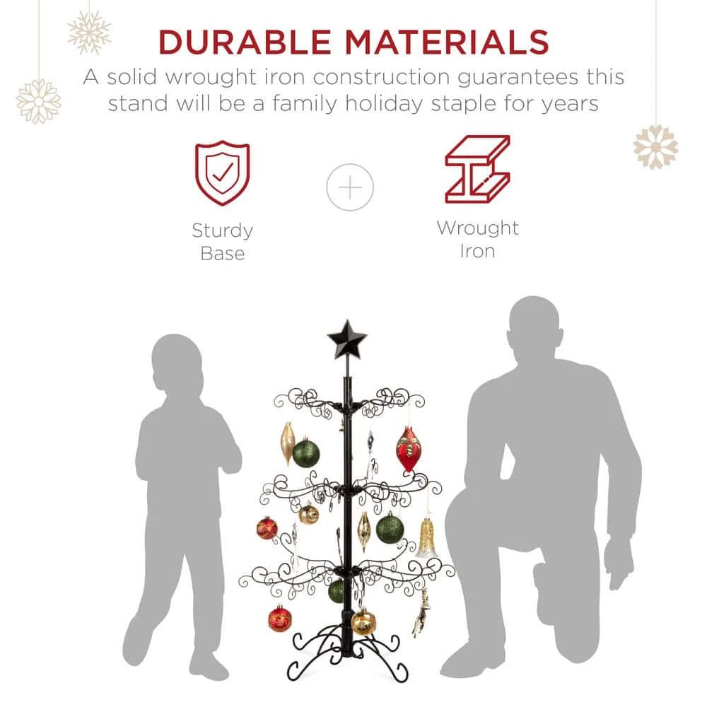 Show off your favorite decorations with a fresh spin on a holiday classic. Our 3 ft. Wrought Iron Ornament Display uses 3-tiers of folding iron hooks to show off everything from tinsel to your best heirloom ornaments. This product includes a quick & easy setup for 1-person in as little as 15 min. Step 1, unfold the base and insert the tree rack, Step 2 insert any extra tiers and unfold the storage hooks, Step 3 attach the star topper and enjoy. Add our decorative star topper and you have a brand new holiday staple.