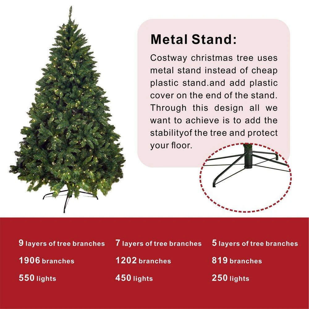 - 5ft. Christmas tree: bottom tube diameter 0.74 in. iron feet, with green gragline and green iron feet tree maximum diameter 37.4 in. 5 tiers 819 total branches, 250 lights, 8 functions, warm white lights