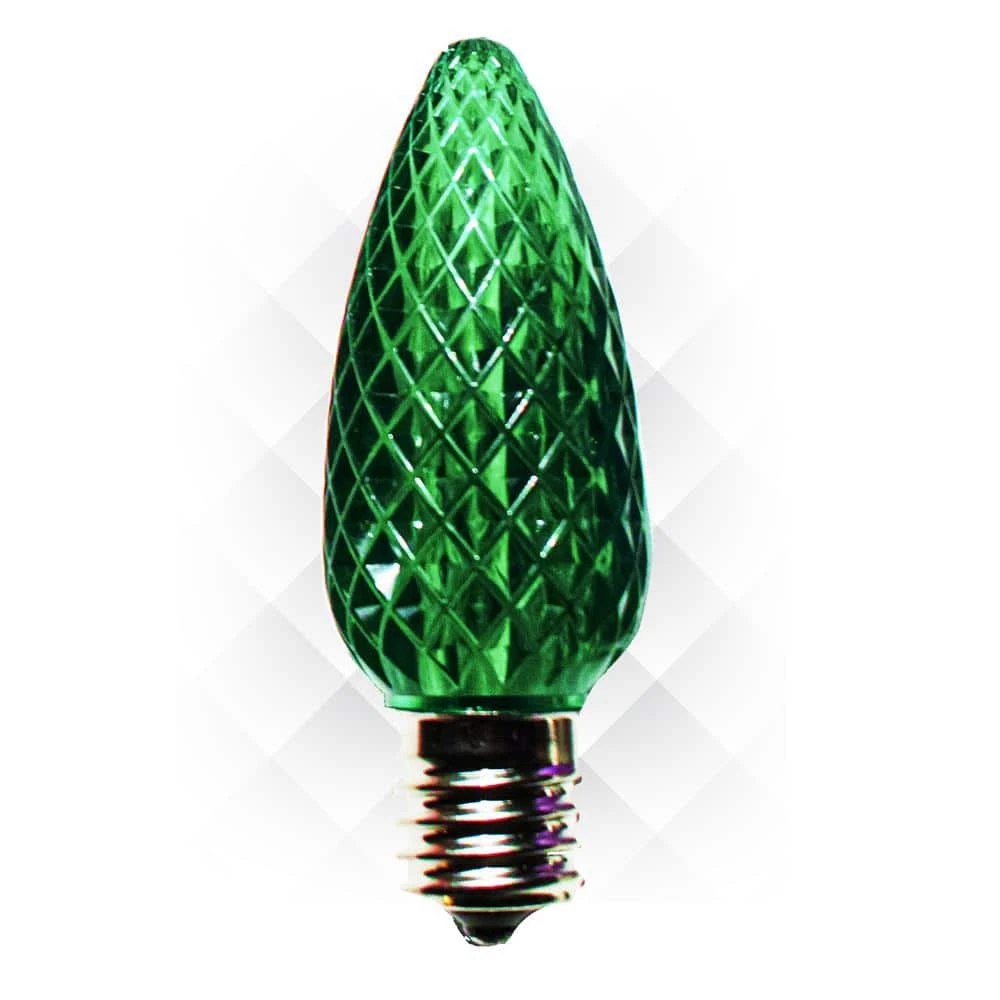 Create a classic Christmas display with the Holidynamics Green C9 LED bulbs this year. The faceted lens of the Holidynamics C9 Bulb offers brightness and sparkle to your design. Molded from new material for maximum clarity, UV resistant and expertly sealed to prevent corrosion and water damage, our bulbs will maintain their color and brightness for years to come. Each Bulb has 1 SMD LED with 3 embedded chips. SMD LED technology is the latest in C9 bulb technology, creating richer color, more consistent brightness and a 360 degree viewing angle. Our line of C9 bulbs have E17 bases so that they are compatible with all traditional C9 cord, making it easy to upgrade your existing incandescent C9 lights to energy efficient LED. You can also pair them with our C9 cord to create a brand new light set for you holiday design. Use them along your roof-line, to line walkways and accent trees.