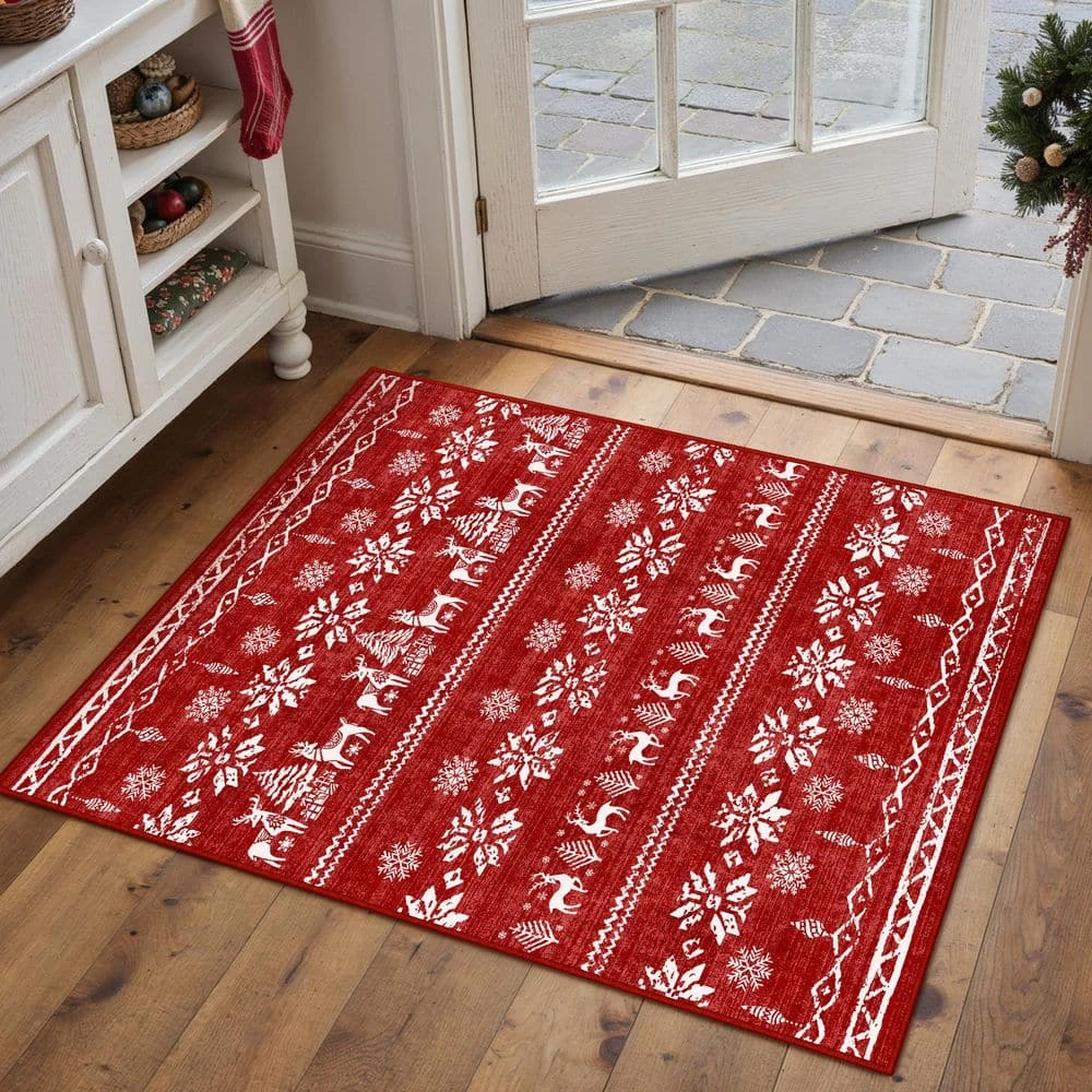 HaiiMeid area rug blends festive holiday charm with bohemian flair, featuring a vibrant red design that artfully combines classic Christmas motifs like trees, reindeer and snowflakes with intricate boho patterns for a uniquely stylish seasonal accent. The innovative 50G dotted sponge backing delivers exceptional cushioning comfort underfoot while providing superior slip resistance that outperforms standard TPR bases with faster crease recovery. Crafted from durable, pet-friendly materials with a stain-resistant surface that wipes clean effortlessly, this eye-catching rug brings joyful Christmas spirit to your home while standing up to heavy foot traffic and daily wear throughout the holiday season.