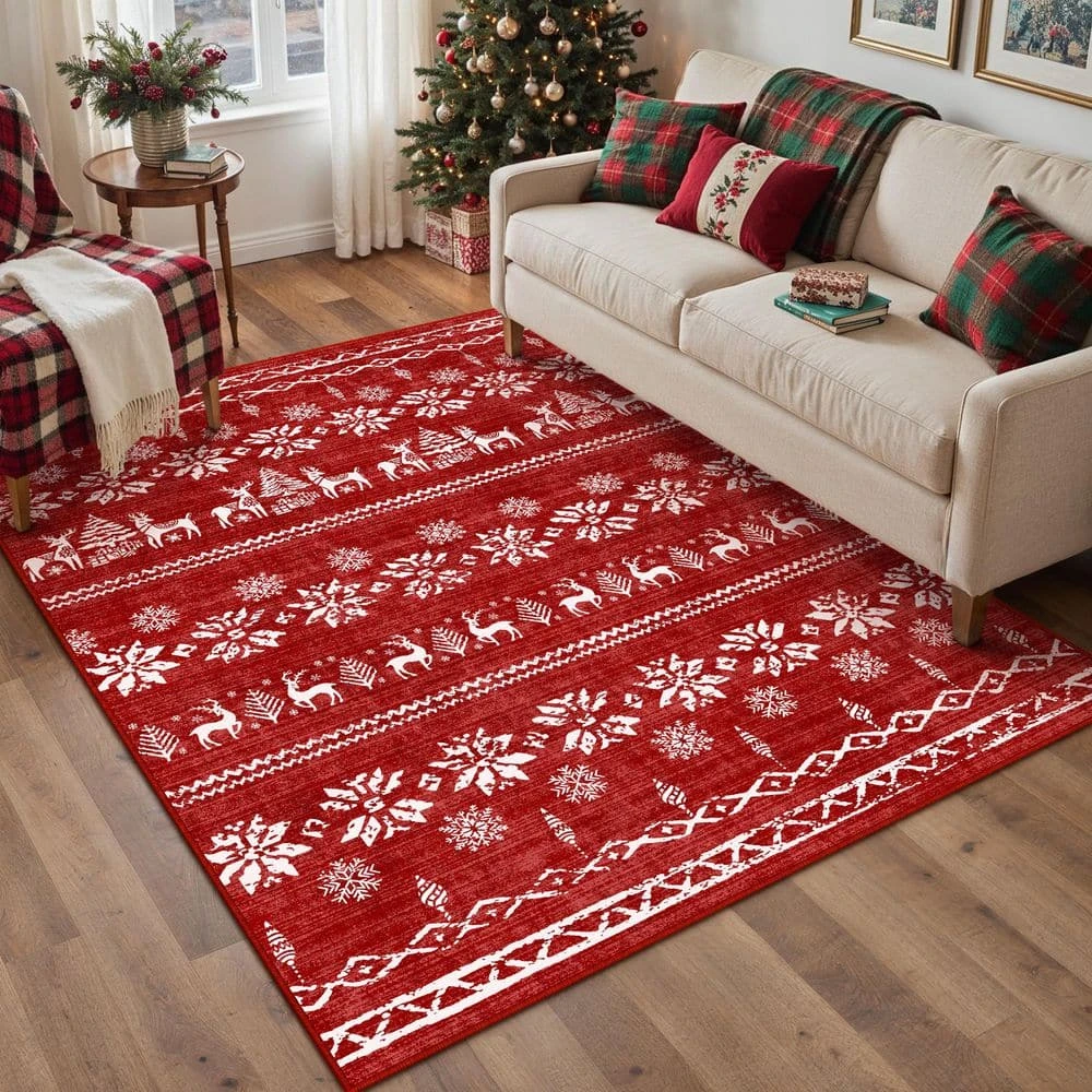 HaiiMeid area rug blends festive holiday charm with bohemian flair, featuring a vibrant red design that artfully combines classic Christmas motifs like trees, reindeer and snowflakes with intricate boho patterns for a uniquely stylish seasonal accent. The innovative 50G dotted sponge backing delivers exceptional cushioning comfort underfoot while providing superior slip resistance that outperforms standard TPR bases with faster crease recovery. Crafted from durable, pet-friendly materials with a stain-resistant surface that wipes clean effortlessly, this eye-catching rug brings joyful Christmas spirit to your home while standing up to heavy foot traffic and daily wear throughout the holiday season.
