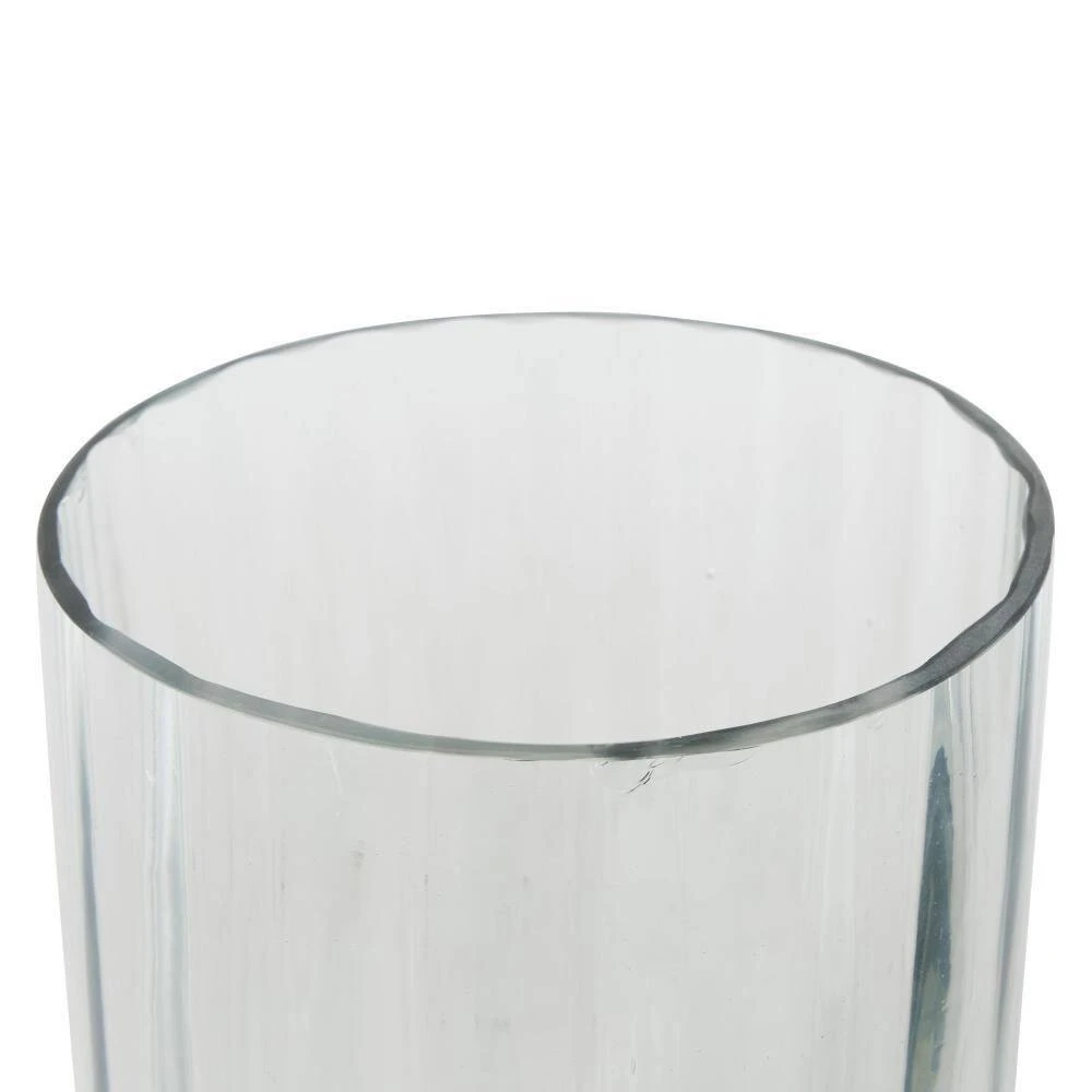- Modern candle holder for home decor is molded from blown glass, ribbed on the body, and has an elevated base