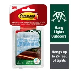 Command Clear Outdoor Rope Light Clips brighten up the interiors and exteriors of your living or working spaces without damaging surfaces. These clear clips blend into walls so you can showcase your decor. They also are water- and UV-resistant to hold strong through rain, snow, sleet and heat. A great home improvement item, these outdoor clips stick on a variety of smooth surfaces without leaving holes, marks or residue. Use these wall clips for hanging outdoor rope lights, Christmas decorations, holiday lights, LED lights, rope lights, patio lights and cords. Mount these light hooks on doors, flat vinyl siding, soffits, finished fences, tile, painted cinder block and windows and enjoy the damage free hanging of your favorite lights. Use these light hooks inside or outside your home, office or dorm to elevate the appearance of your space without tools. Directions are included that show how to use the wall clips. A clever decorating solution that doesn’t damage surfaces, these light clips will help you fearlessly change your space. One package contains 12 clear outdoor light clips and 16 water-resistant Command Strips. Use one light clip for every two feet of lights. Decorate, organize and celebrate damage free with Command.