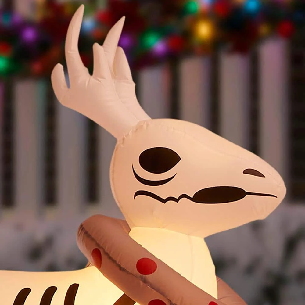 Deck the yard with a colossal Airblown Inflatable Jack Skellington sleigh. This amazing colossal inflatable features Jack Skellington as Santa, 2 skeletal reindeer and Zero leading the way with a red nose. Measuring an eye-catching 11.5 ft. W, our incredible Jack Skelling Sleigh Scene is a must-have for fans of Tim Burton’s The Nightmare Before Christmas. Setup is super simple. Just plug it in, stake it down and watch the magic unfold. Includes everything needed for easy outdoor setup.