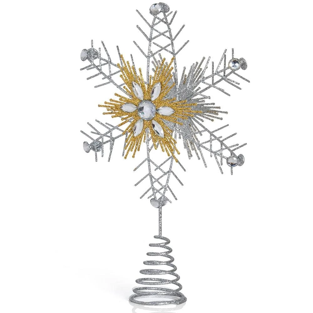 ORNATIVITY Glittered Snowflake Tree Topper has little silver gems attached in strategic places, which add a beautiful decorative touch to the ornament, the silvery and golden treetop decoration will glisten and reflect any lights that are hung throughout the area and will complete the winter wonderland feel you are aiming for. Because of its metallic and refined silver and gold finish, this topper allows for the use on various themed trees, it’s great quality allows for firm support on the tree and can be stored and reused. This item is made with high quality glitter to prevent the unwanted messes during the holiday season, when Christmas is over, the tree topper can act as a steady decoration for your table, shelf or piano top. Keeping the topper as a decoration will extend the Christmas mood in your home. This medium sized metal lightweight tree topper is coated in a layer of silver and gold glitter and has a spiral wire connected at the bottom allowing for secure attachment to a tree, the spiral is made sturdy so it can stand on a flat surface, your holiday spirit will be enhanced to an extraordinary level with this wintery holiday item.