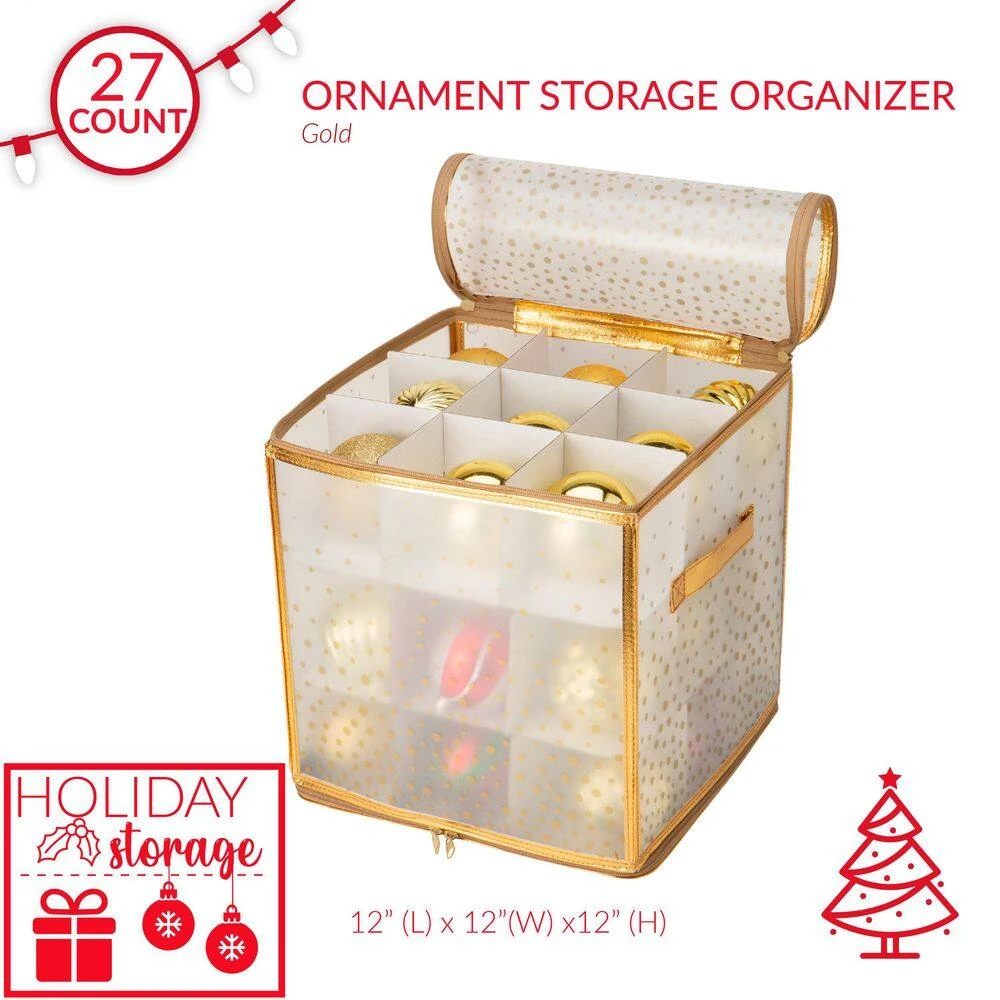 This Simplify 27-Count Ornament Organizer is a perfect holiday accessory to keep around the home. Helps keep up to 27 ornaments safely stowed away until the next holiday season. Comes with handles for easy carrying and a zipper-lid closure for protection. Supportive cardboard dividers help protect and organize ornaments and see through front allows you to view your ornaments without having to go through the unit.