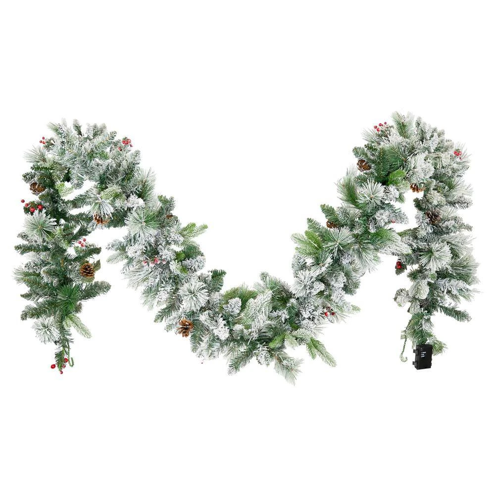 Deck the halls with this festive Christmas garland. Designed for both indoor and outdoor use, this lovely light-up Christmas garland can be used nearly anywhere. Wrap it around stair railings, drape them around mantels, or hang them around window frames. This garland is made from a combination of PVC and polyethylene needles to replicate the look of real pine boughs. Plus, it is durable enough to last season after season. The 9 ft. Christmas garland features faux pinecones and berries for a cheerful design as well as cotton flocking for a realistic dusting of snow. The garland is pre-lit and features 70-LED lights throughout the strand. The LEDs produce a warm white color that will lend a cozy holiday glow to any area. The garland requires 3-AA batteries to operate (not included). Plus, it features a convenient timer. When the timer function is on, the lights will illuminate for 6-hours then turn off automatically for 18-hours.