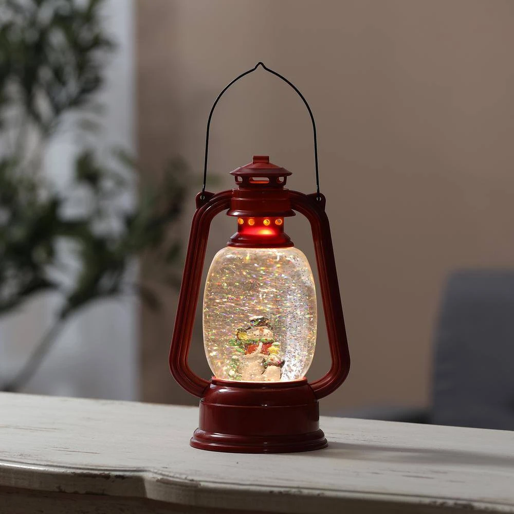 Enhance the beauty of your home this holiday with this lovely decorative holiday lantern. The holiday lantern can be hung or used as a centerpiece. The red lantern features a snowman and penguin along with a LED adding to the festivities of the season. The lantern is also filled with liquid and glitter that highlights the LED light when on.