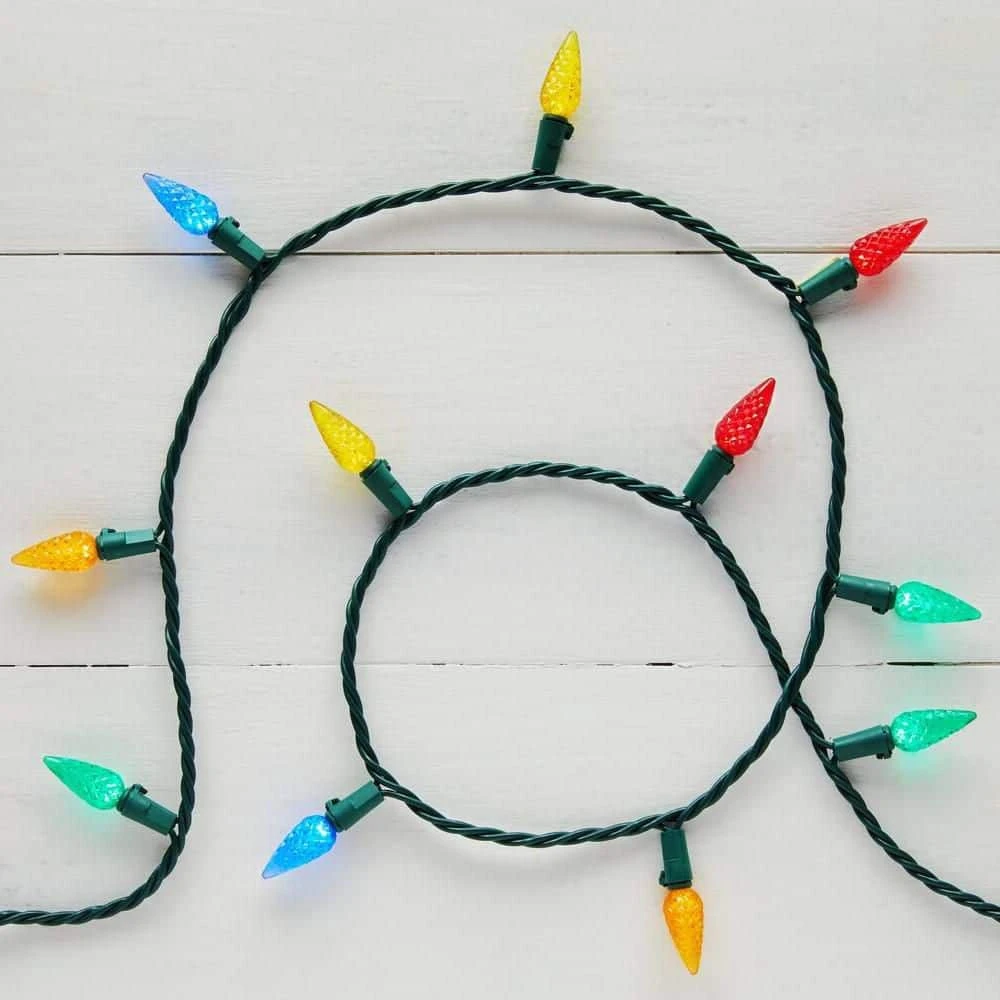 Create a dazzling display with these Home Accents Holiday 150 Count Multi-Colored Faceted C6 LED Lights. These LED lights are cool to touch when lit. There is 49 ft. 8 in. of lighted length to use along gutters, in trees, along fence or anywhere you want to create an outdoor light show. These lights can also be used indoors along railings or wall trimmings. They connect up to 30 sets on one outlet for an even more dramatic display of light. These multi-colored faceted lights are long lasting up to 25,000 hours (up to 15 holiday seasons). These C6 lights have a green wire and include three spare bulbs and two fuses. These lights come with a 3 year warranty, so you’ll have a merry holiday season year after year.
