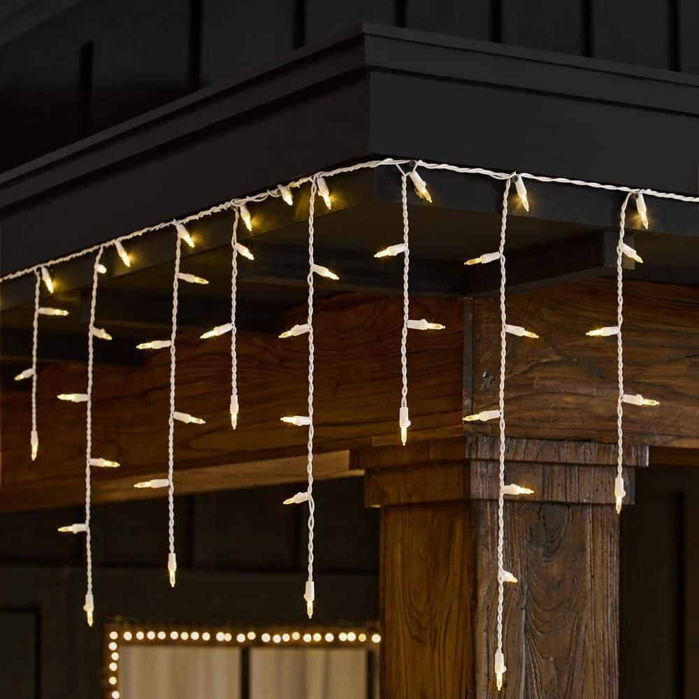 Turn your home into a winter wonderland with these Home Accents Holiday 200 Warm White Mini LED Icicle Lights. These warm white mini LED lights are cool to touch when lit. These icicle lights come with 36 twinkling and 164 steady lights. There is 17 ft. 6 in. of lighted length to use along gutters, in trees, along fence or anywhere you want to create an outdoor light show. These lights can also be used indoors along railings or wall trimmings. They connect up to 22 sets end-to-end on one outlet for an even more dramatic display of light. These mini icicle lights are long lasting up to 25,000 hours (up to 15 holiday seasons). These mini icicles are displayed on a white wire and include six spare bulbs and two fuses. These lights come with a 3 year warranty, so you’ll have a merry holiday season year after year.