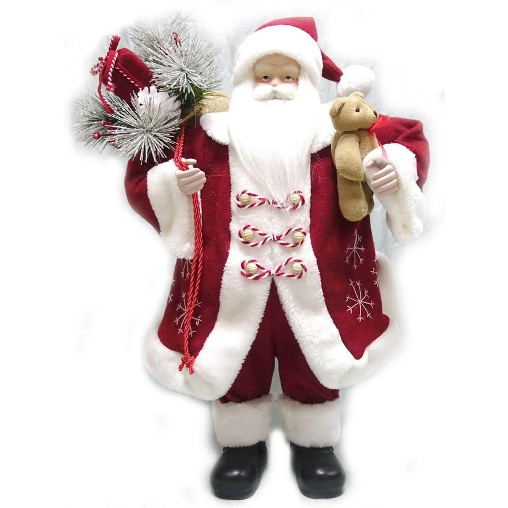 Add a touch of holiday cheer to your home with this 24 in. Fabric Santa. He is a jolly addition to a window, mantle, or table. Wearing a red burlap coat trimmed with white faux fur, carrying a burlap sack filled with goodies, Santa is ready for festivities. A porcelain head and hands and his friendly face create a lifelike display that pairs with any holiday decor theme.