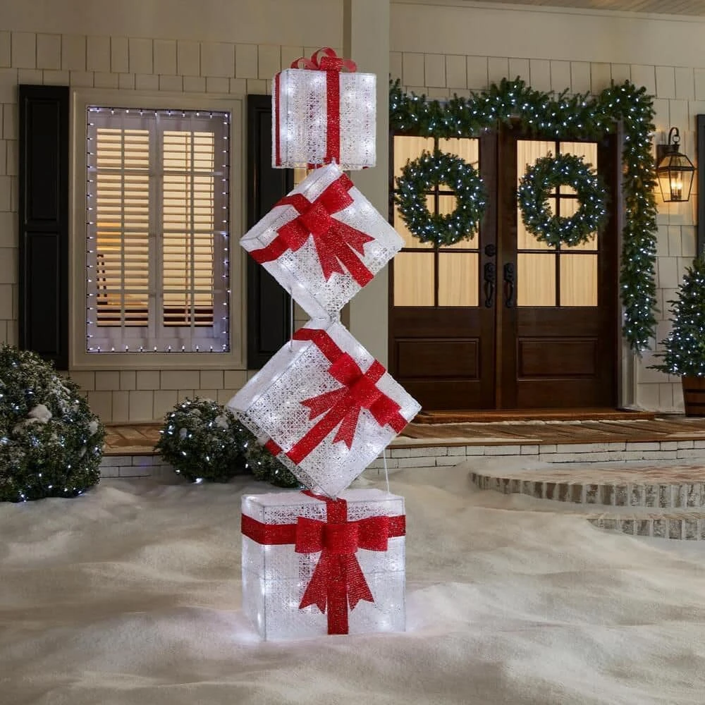 Create a festive Christmas display with this 5.5 ft. Icicle Shimmer Twinkling LED Stacked Gift Boxes from Home Accents Holiday. This gift box stack is suitable for indoor or outdoor use. It has 120 cool white LED lights and a durable pre-wired metal frame. It plugs into a standard outlet for flexible placement. Ground stakes, spare bulbs, and fuses are included. It’s the perfect yard decoration for your home, front porch, or yard. Pair with other Icicle Shimmer holiday items.