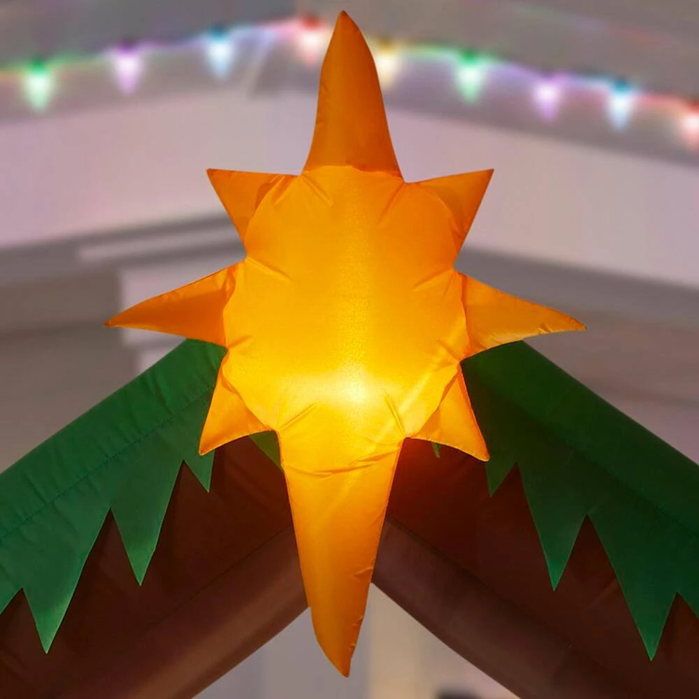 Bring holiday happiness to passersby with this Airblown Inflatable Nativity Scene. Featuring the Holy Family in a humble barnyard setting, this beautiful decoration is perfect for sharing Christmas cheer. Use it as a standalone piece or group it with other inflatables for a supersized scene. Setup is easy – just plug it in, stake it down and enjoy the fun. Includes everything needed for outdoor setup.