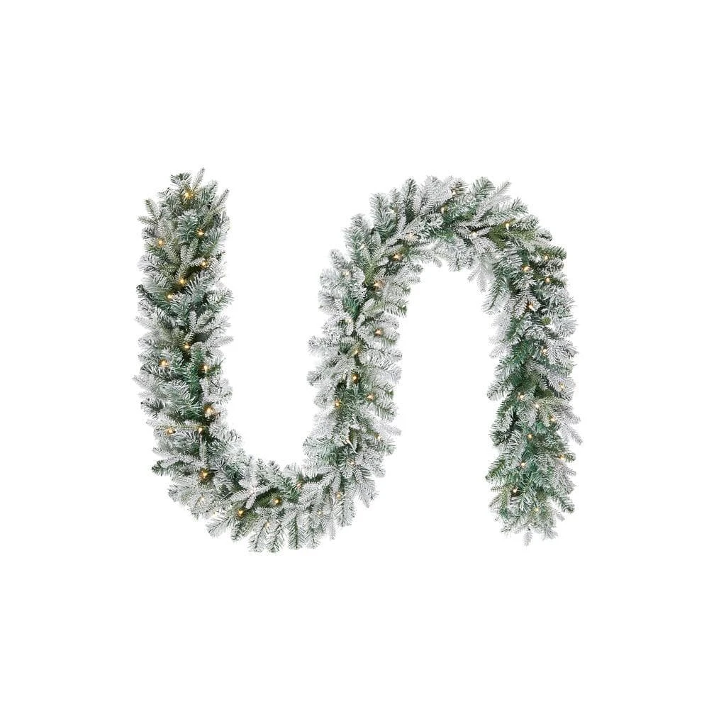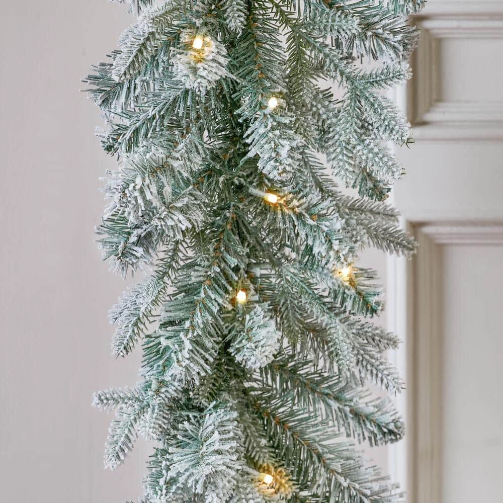 Light up the holidays with this 9 ft. Pre-Lit Flocked PE and Pine Garland from Home Accents Holiday. Illuminated with 50 battery-operated, warm white LED lights, the natural-looking garland has a shimmering glow, frosted limbs and 184-tips. It’s perfect for above an entryway, fireplace or stairway rail. This garland has a timer function, is rated for indoor and outdoor covered use and uses 4 AA batteries (not included).
