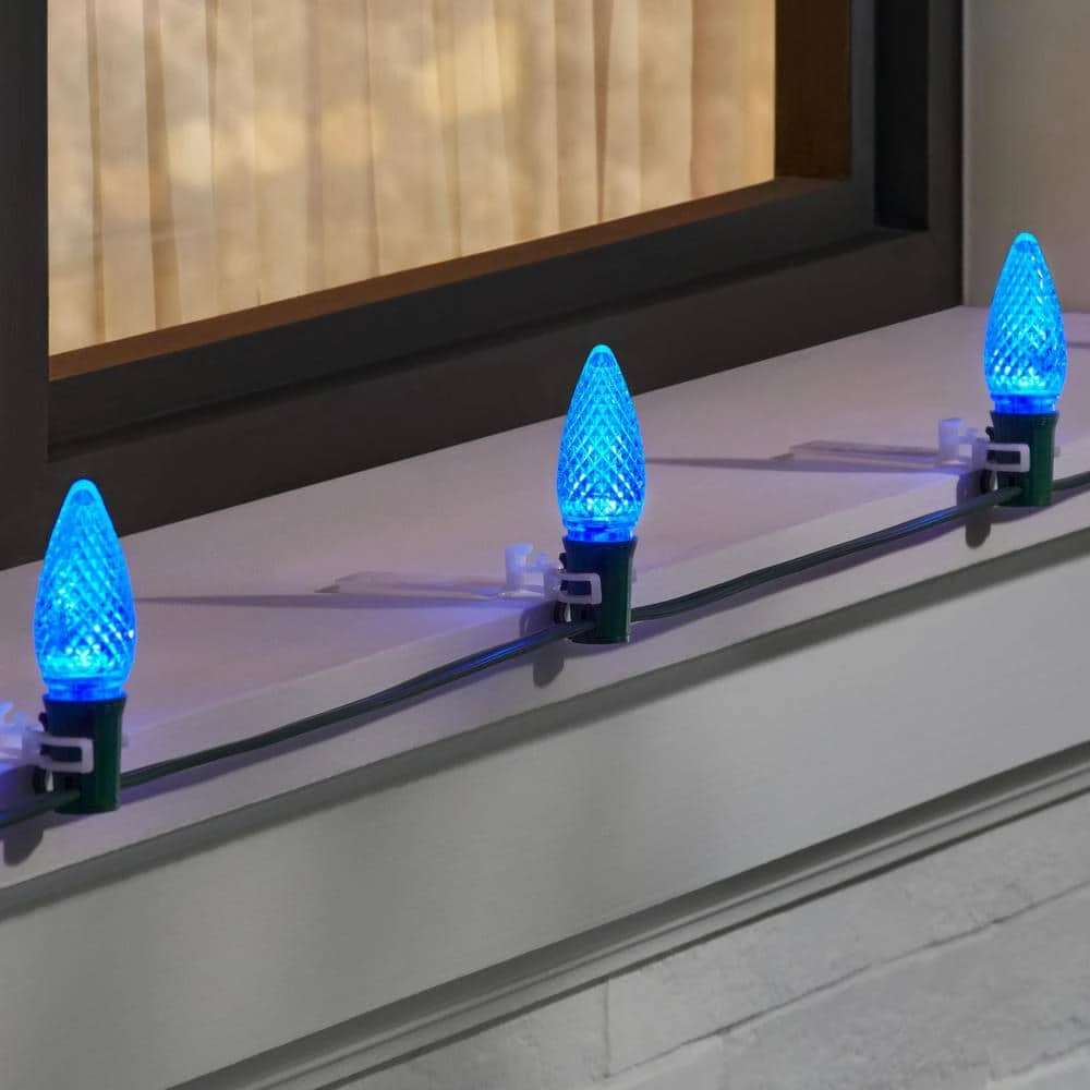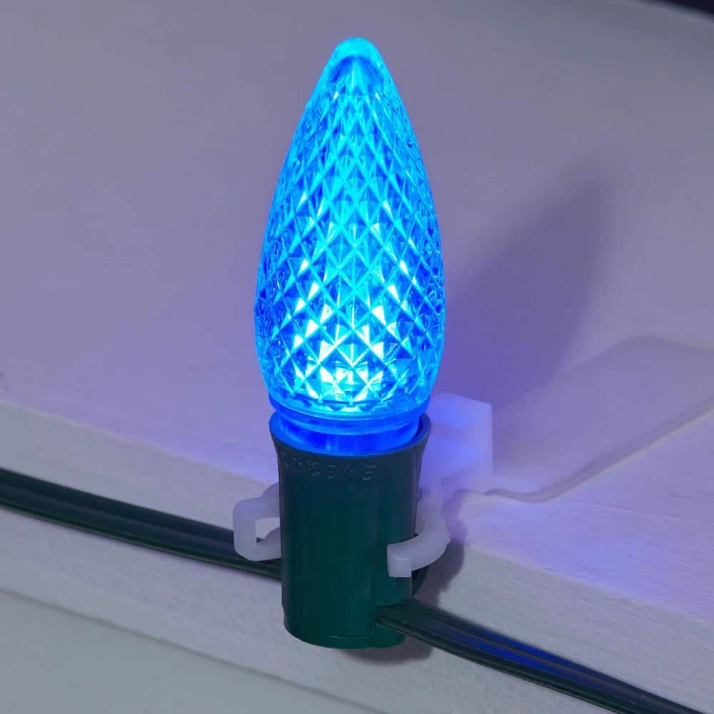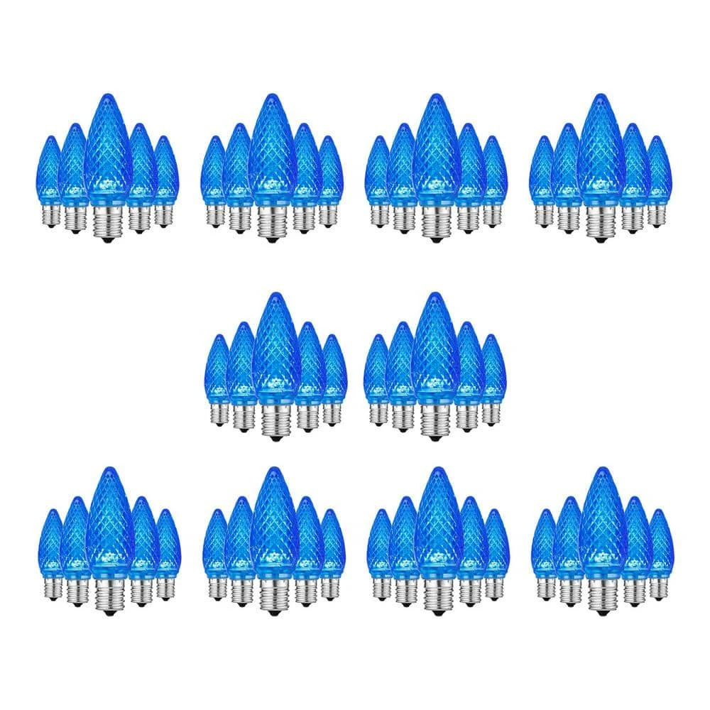 Enhance your holidays at home with these Home Accents Holiday blue commercial grade, shatter-resistant faceted LED C9 replacement bulbs (50-Pack). The steady burning bulbs with dimmable feature capability provide the ultimate brightness to perfectly showcase your Christmas decorations. These durable LEDs are shatter-resistant to last you over time, plus they can be used indoors and outdoors. Each bulb is designed to provide 50,000 hours of use. Each bulb fits into a standard C9 incandescent light string set.