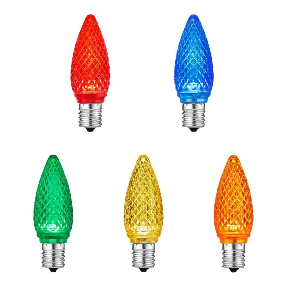 Enhance your holidays at home with these Home Accents Holiday multi-colored commercial grade, shatter-resistant faceted LED C9 replacement bulbs (50-Pack). The steady burning bulbs with dimmable feature capability provide the ultimate brightness to perfectly showcase your Christmas decorations. These durable LEDs are shatter-resistant to last you over time, plus they can be used indoors and outdoors. Each bulb is designed to provide 50,000 hours of use. Each bulb fits into a standard C9 incandescent light string set.
