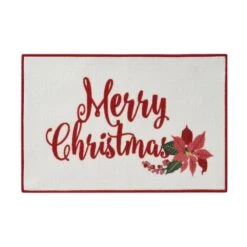 - Holiday accent rug featuring merry christmas in red script with poinsettia plants