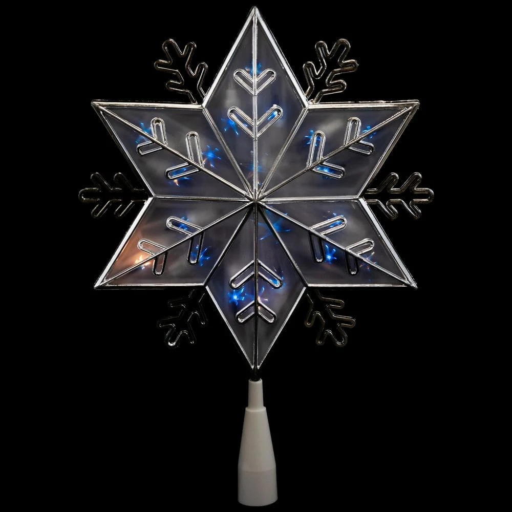 Add the perfect highlight to your Christmas tree with this decorative 8-point snowflake tree topper. It features a silver frame with frosted center, allowing the blue lights to shine through and appear as stars. The double-sided design allows the lights to be seen from all angles.