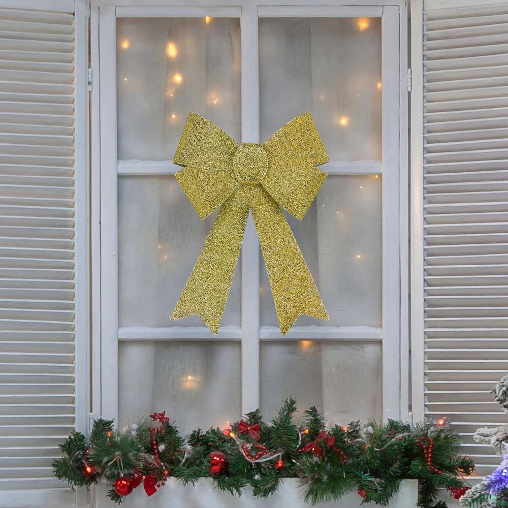 There is nothing like holiday bows to get you in the spirit of the season. Whether you’re decorating your home office or business these bows are a must. Put the finishing touch on your holiday decor with this bow this season and every season after. Product features: Gold bow with soft tinsel. 1-sided design. for indoor use only. Tinsel is lined with plastic for stability. Comes ready-to-attach. Dimensions: 17 in. H x 12 in. W x 1 in. D. Material(s): PVC/tinsel.