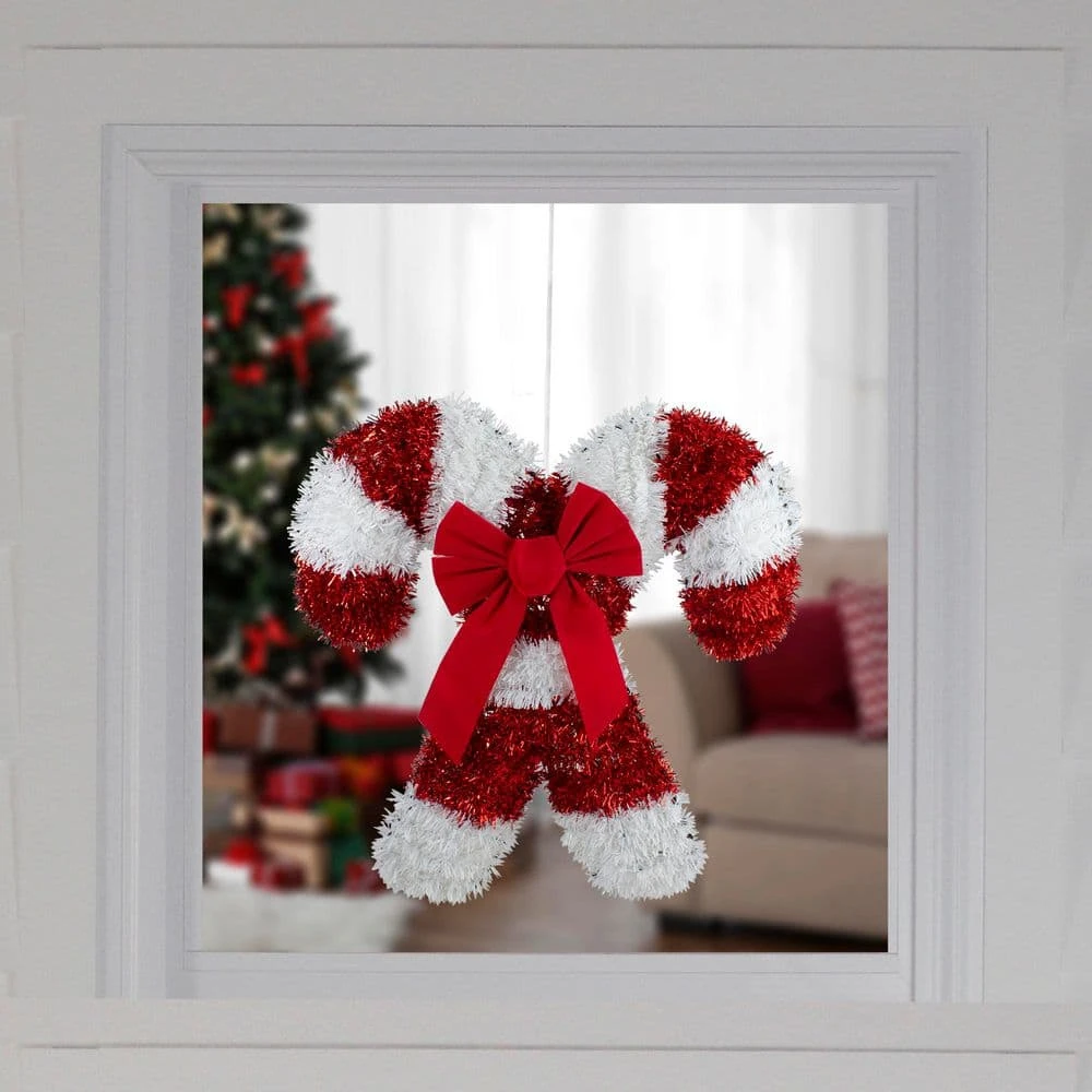 Add festive style to your home this holiday season with this candy cane window decoration. The perfect way to add a pop of color to your holiday decor. Also an easy way to decorate the inside and outside of your home without cords. Product Features: Tinsel candy cane window silhouette. Red and white striped design. A red bow accents the center of the candy cane. Perfect for hanging indoors and outdoors. Dimensions: 19.25 in. H x 18 in. W x 1.25 in. D. Material(s): tinsel/plastic.