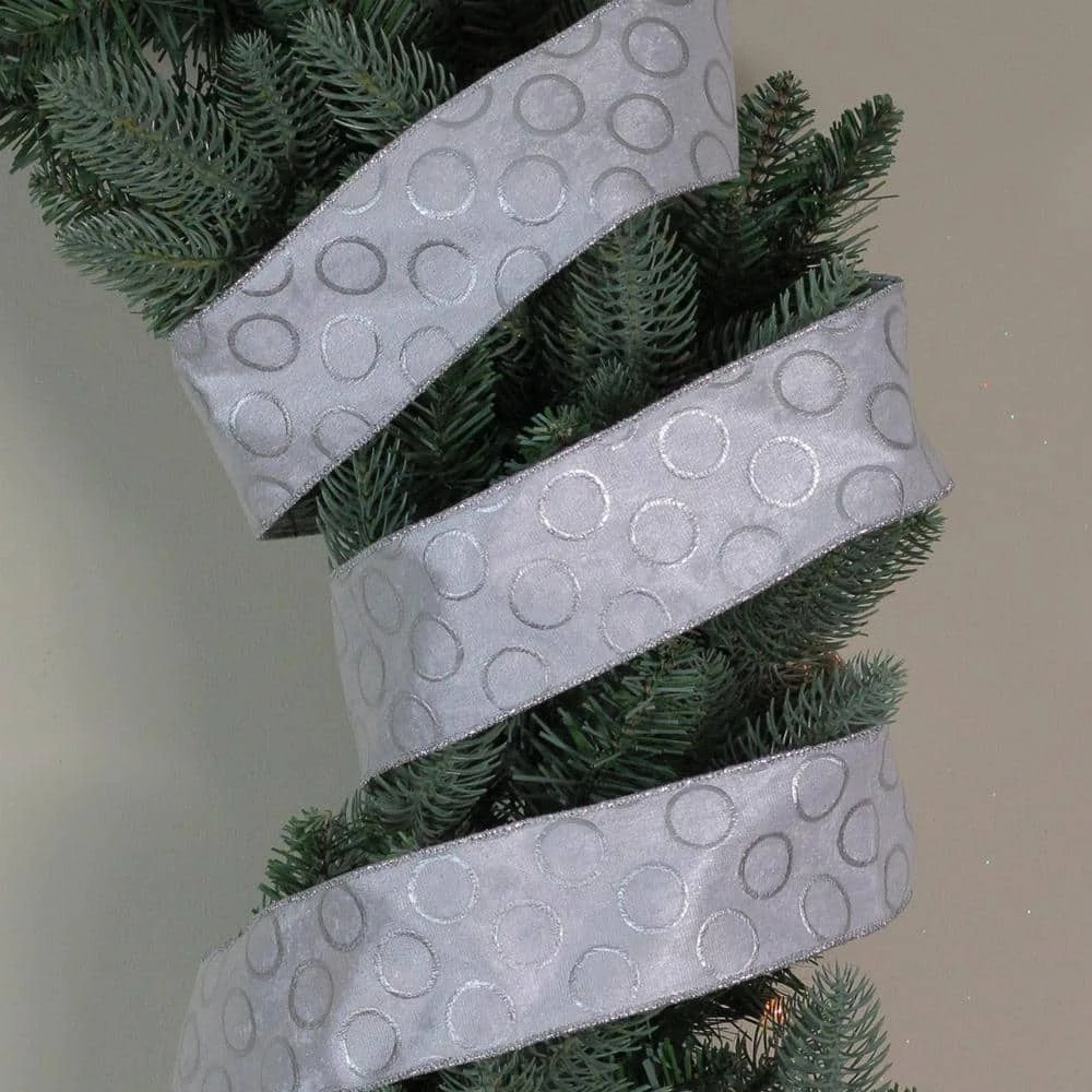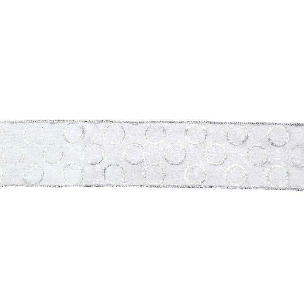 This gorgeous white and metallic silver ribbon with circle pattern would be a great way to decorate your gifts and home for the holiday season. The wired ribbon will help everyday designs maintain their shape and beauty. Whether you’re a florist an event planner or crafter wired edge ribbon is a dream to work with. Add this ribbon to Christmas gifts wreaths or trees for beauty and shine. Features: Features a design of circles outlined in silver. Sewn wire edged ribbon allows you to bend and shape your creations to decorate with ease. Ribbon has a metallic silver trim. Ribbon comes on (1) spools. Dimensions of each spool: 2.5 in. W x 16 yds. in length. Material(s): polyester/metallic.