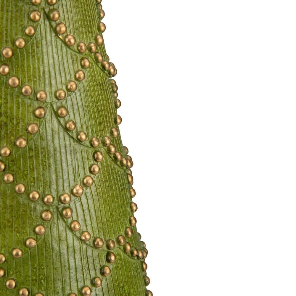 Add a fanciful touch to your holiday decor with this cone-shaped Christmas tree. Featuring a linear design with a green finish accented with golden dots it can be placed just about anywhere a small Christmas tree is needed. Just perfect for tabletops and mantles or to give as a gift to family and friends. Product Features: Christmas tree table top decor. Tree has a vertical lined design. Accented with gold dots outlining the leaves shape. Designed on a gold pedestal and star topper. Freestanding tree can be placed on any flat surface. For indoor decorative use only. No assembly required. Dimensions: 23.5 in. H x 6.5 in. Dia. Material(s): resin.