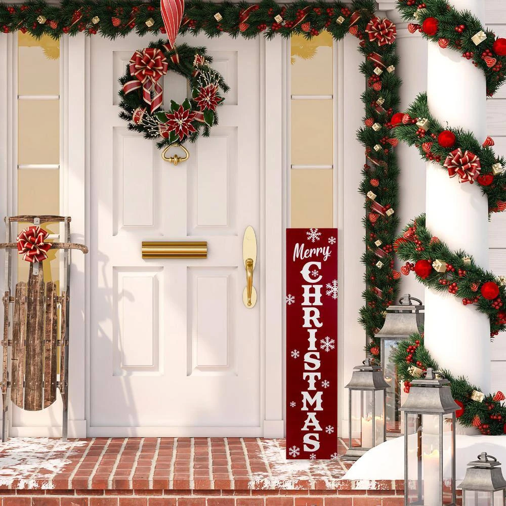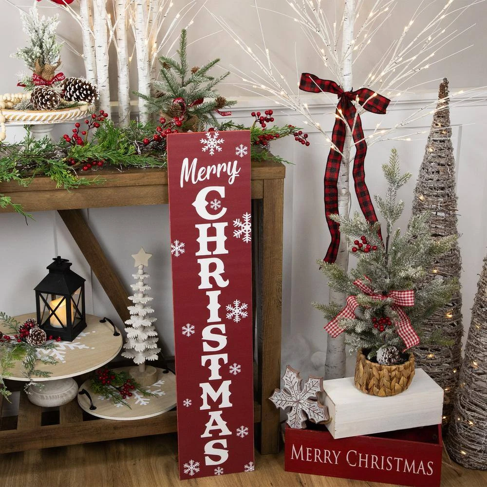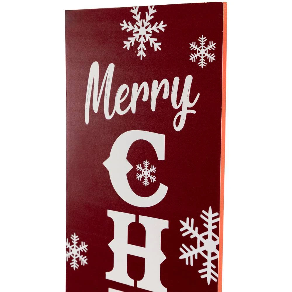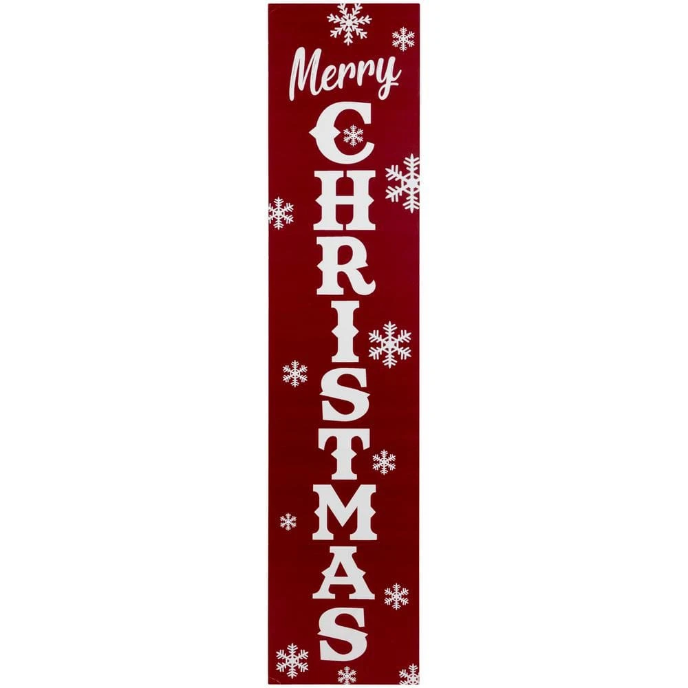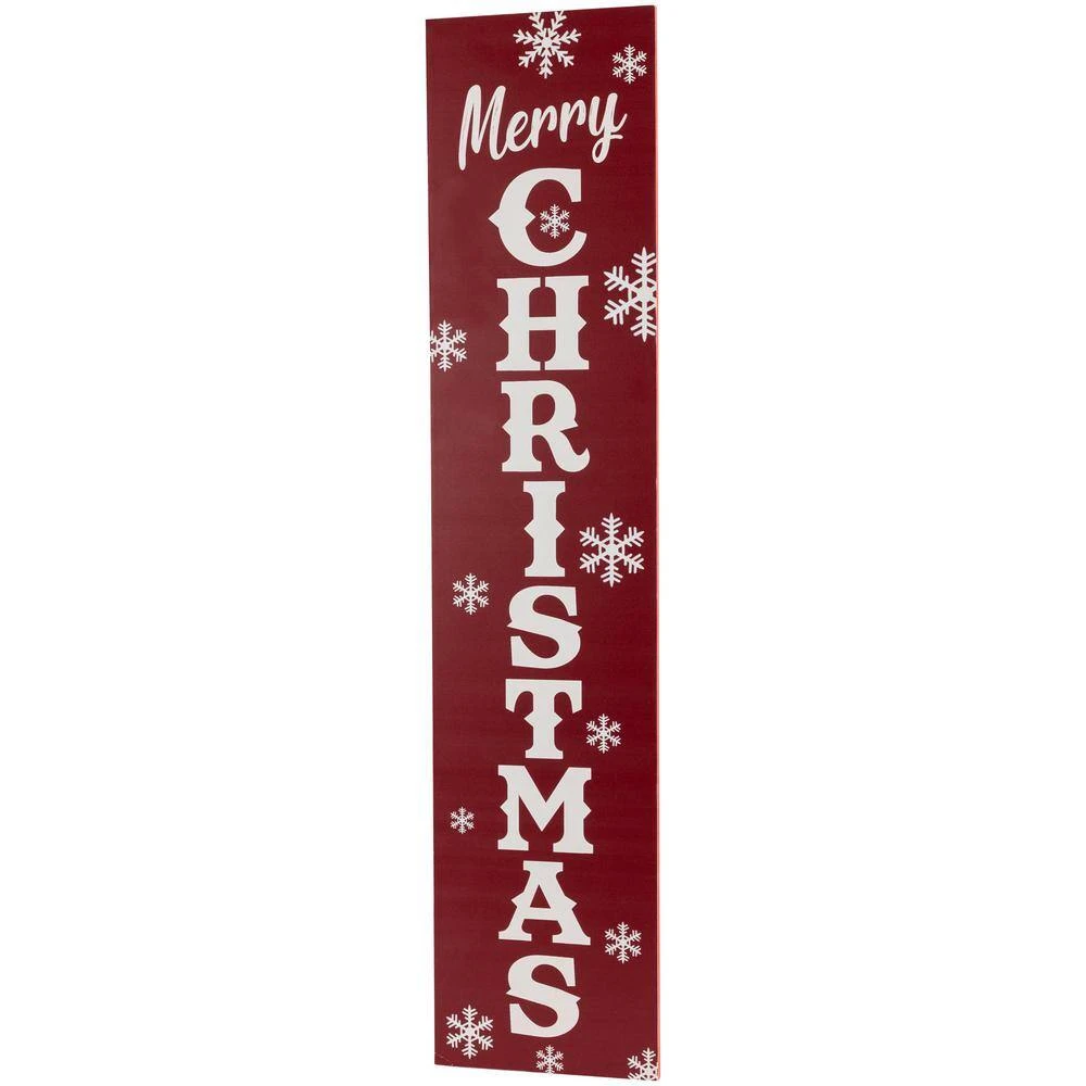 Add a touch of charm to your indoor or outdoor space with this red and white Merry Christmas porch board leaner. Designed with white snowflakes you will be ready to welcome winter and the holiday season. This sign is a great way to make a statement in an entryway living room or family room. Just perfect to welcome guests into your home for Christmas. Product Features: Christmas porch board leaner decoration in red. Sign reads in.Merry Christmas in.. Deep red hue adorned with snowflakes. Saw tooth hanger on back for hanging. Sign can be leaned against a flat surface. Covered outdoor area or indoor use recommended. Dimensions: 36 in. H x 8 in. W x .5 in. D. Material(s): wood.