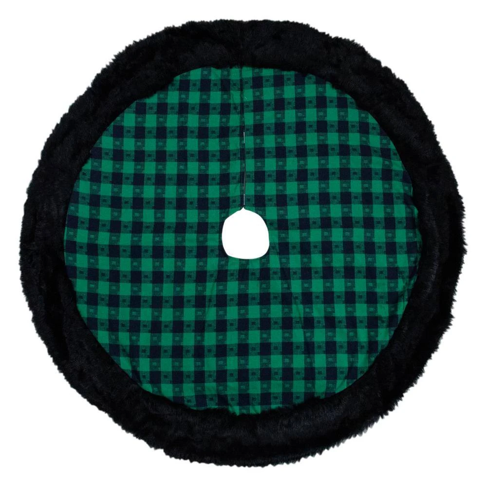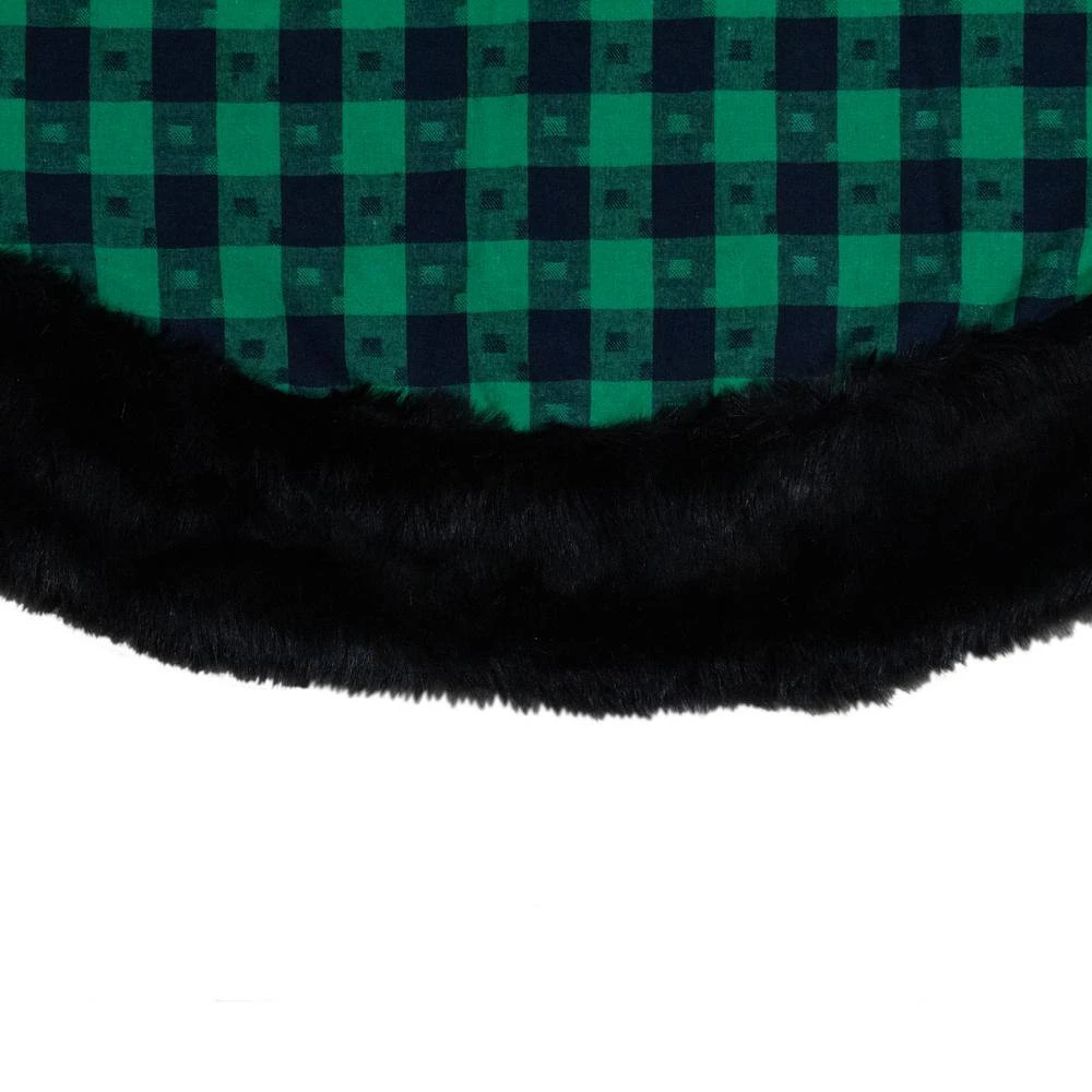 Add a pop of color to your holiday decor with this plaid stocking. The bright green and black design with black a faux-fur trim will make this stocking standout. A perfect addition to your home this Christmas. Product Features: Bright green and black plaid Christmas stocking. Small square designs within the plaid. Solid green on the back of the skirt. Button closure in the back for placement. Black faux fur cuff border. 1-sided design. Spot clean or dry clean only. Recommended for indoor use only. Perfect to protect floors and carpets surrounding your tree. Note: Matching Christmas stocking sold separately. Dimensions: 48 in. Dia. Materials: polyester/faux fur.
