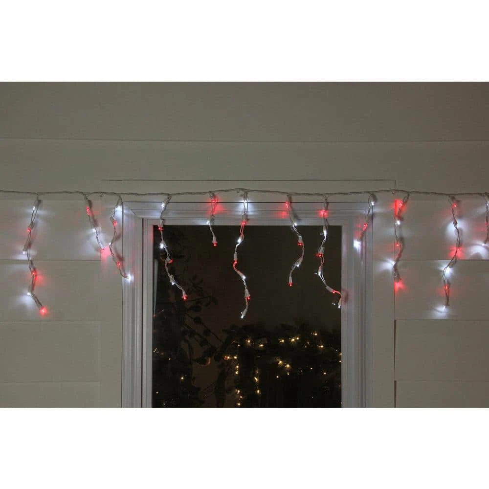 Add some twinkle to your Christmas decor with these red and pure white icicle LED lights. Mounted on a white wire, 100 lights are spaced 3 in. apart. Lights are equipped with the Lamp Lock feature, which makes them replaceable, interchangeable, and keeps them from falling out.