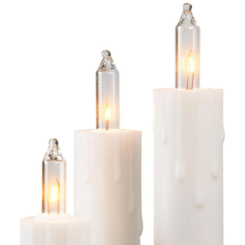 Add a divine glow to your space with these dripping candle Christmas lights. They are perfect luminaries to make your home more welcoming and attractive for a Christmas gathering. Never fail to include these lights as a centerpiece for any special event in your home. Product Features: Color: clear bulbs/green wire. Number of bulbs on string: 21. Number of candle clusters: 7. Bulb size: mini. Bulb type: incandescent. Spacing between each cluster: 18 in. Lighted length: 9 ft. Total length: 11 ft. 24 in. lead cord. Additional Product Features: Light bases have clips on them so you can easily attach the lights to your tree or any other desired surface. UL Listed for indoor or outdoor use. If 1-bulb burns out the rest will stay lit. Comes with replacement bulbs and spare fuse. Contains 1 plug with end connector which allows you to stack multiple sets together (not to exceed 210-Watt). Wire gauge: 22. 120-Volt 60 Hz .07 Amp 8.4-Watt. Dimensions of candle clusters: 3.25 in. H x 2.25 in. W. Material(s): plastic/glass bulbs/wire.