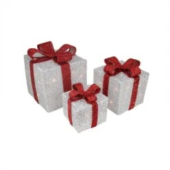 Nothing says Christmas like gift boxes wrapped in bows. Adding a touch of illumination will give your yard that special touch. Place on porches lawn or have them inside to create the perfect seasonal setting. Product Features: Pre-lit with a total of 35 clear lights. Bulb size: minimum 71 in. white lead cord. Includes: one 5.25 in. H x 6 in. W x 6 in. L 8-light gift box. One 7 in. H x 8 in. W x 8 in. L 12-light gift box. One 9 in. H x 10 in. W x 10 in. L 15-light gift box. Additional Product Features: If 1 bulb burns out the rest will stay lit. Boxes are connected and cannot be used separately. Contains 1 plug with end connector which allows you to stack multiple lighted items together (not to exceed 210-Watt ). UL listed for indoor or outdoor use. Ground stakes not included. Wire gauge: 22. 120-Volt 60 Hz 0.12 Amp 14.4-Watt. Material(s): tinsel/metal/glass bulbs/wire.