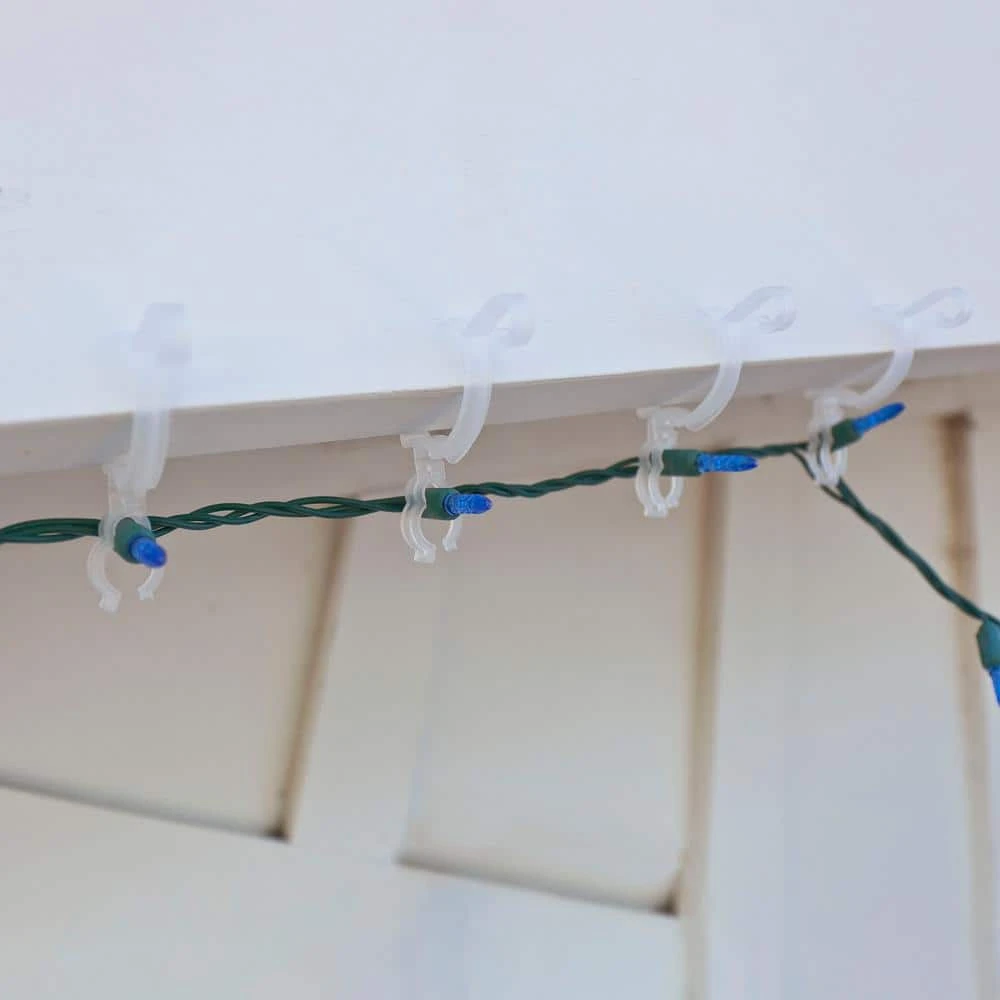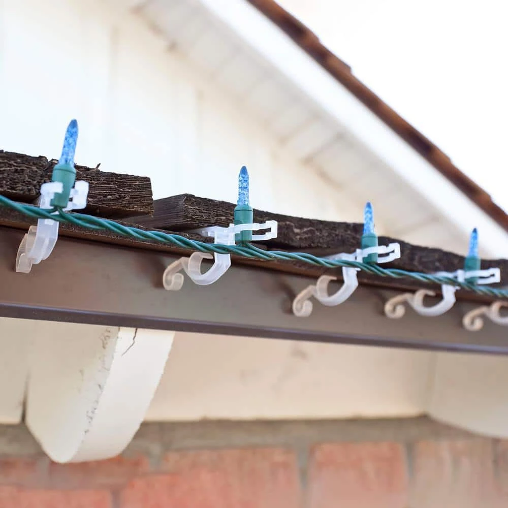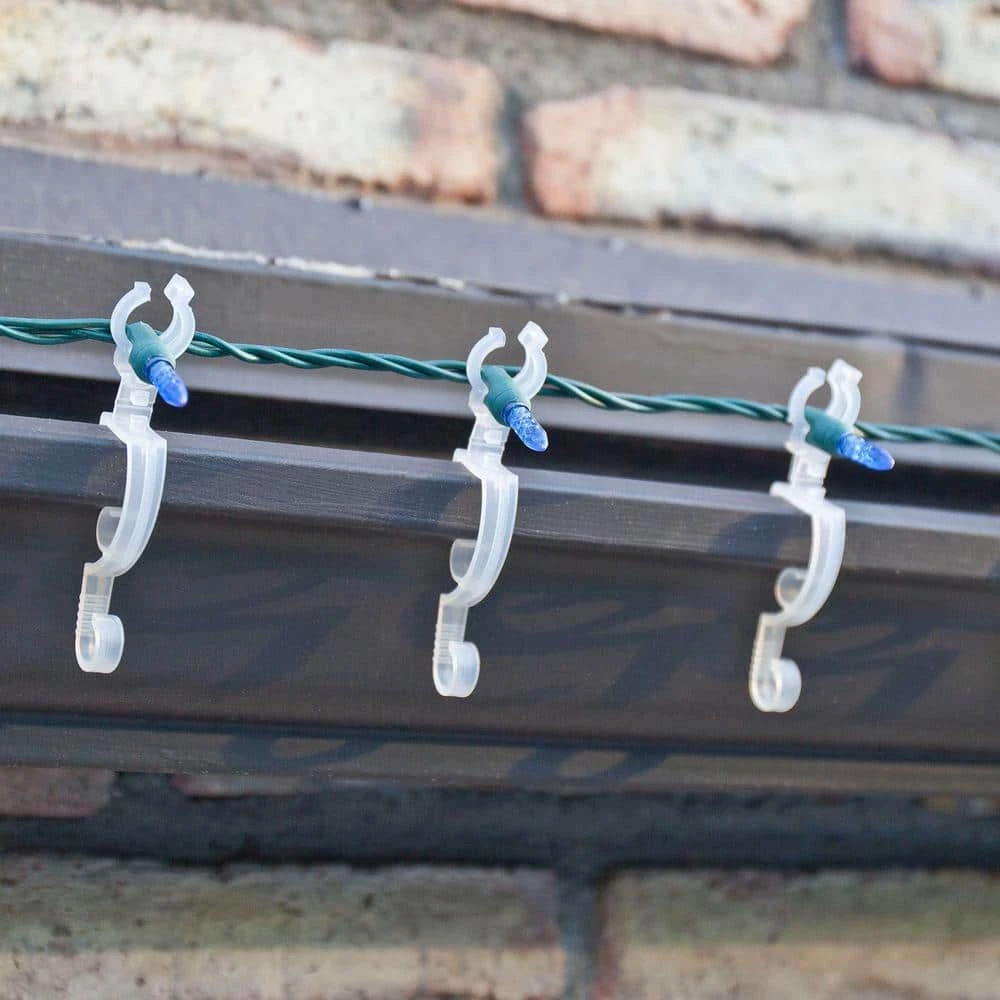 Christmas decorating has never been easier with all the new gadgets on the market. Makes decorating a breeze instead of a chore leaving time for you to enjoy all the holiday fun. Light strings attach to this clear clip through wire guides to securely hold lights with no forcing or twisting. You will love decorating from this point and ongoing for your upcoming holiday. Product Features: Bucket of clear plastic gutter and shingle clips. Works on shingles tiles eaves gutters fences gates railings and patios. Works with most C7 C9 mini icicle rope curtain and LED light sets. Can also be used for garland or other decorations. for indoor or outdoor use. Made of weatherproof and reusable material. Not intended for permanent installation, for seasonal use only. Hooks are designed to fit all standard gutters and shingles and work on most roofs . Dimensions: 4 in. H x 0.50 in. W x 1 in. D. Material(s): plastic.