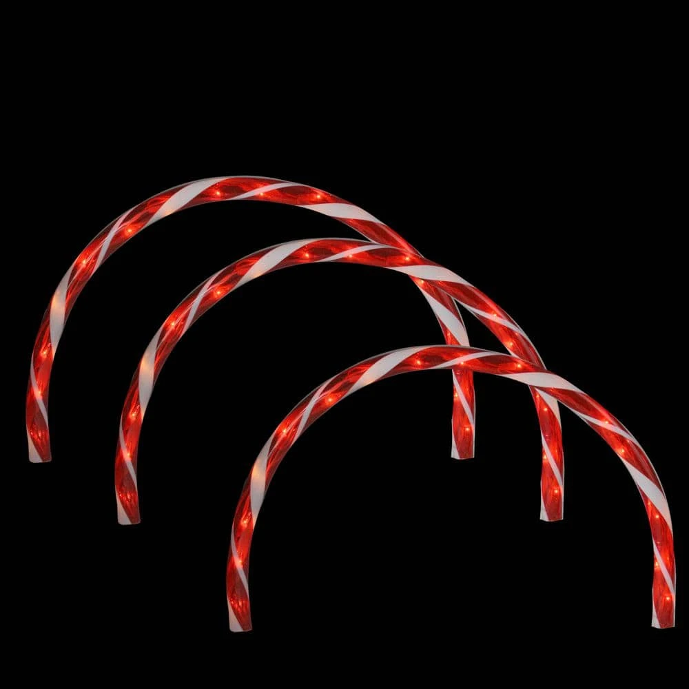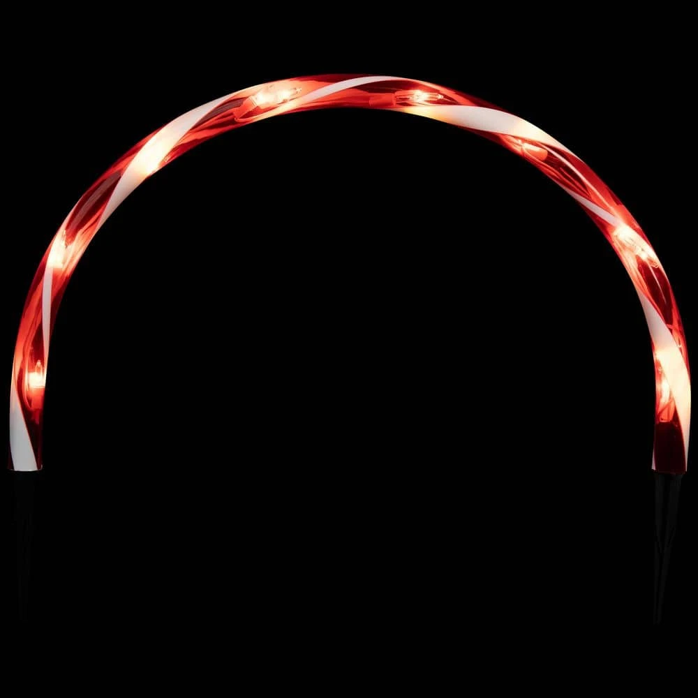 It’s beginning to look a lot like Christmas. Create a nostalgic Winter wonderland and celebrate the Christmas season in style with these arch pathway markers. Perfect for lighting up your archway walkway flowerbed or driveway. Simply place as desired light up and enjoy the holidays. Product Features: Color: red and white stripe arches/white wire. Number of bulbs on set: 51. Bulb size: mini bulb. Spacing from the plug to the first arch: 26 in. Tail length: 8 in. Spacing between arches: 25 in. Additional product features: Durable plastic construction. UL certified and approved for indoor/outdoor use. 120-Volt 60 Hz .165 Amp 19.8-Watt. End-to-end connectors allow you to connect multiple sets together (max 10 sets of this product not to exceed 210-Watt). Includes lawn stakes spare bulbs and fuses. Arches are all connected together on one cord. Dimensions of each arch: 11 in. H x 20 in. W x 1 in. D. Material(s): plastic/wire/glass bulbs.