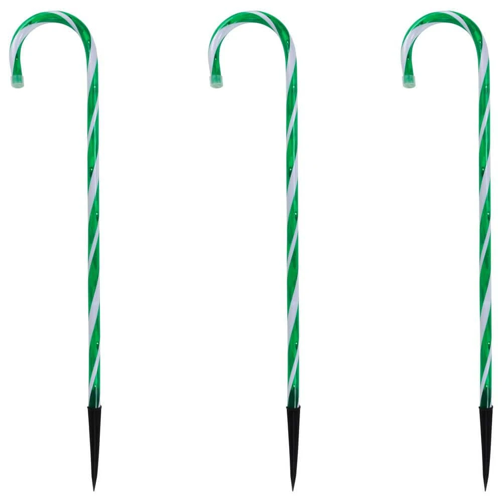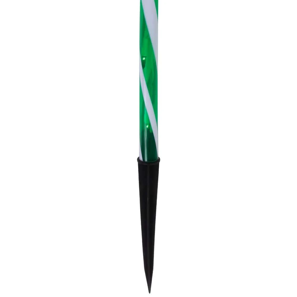 Light up your holiday season with this set of candy cane pathway markers. These green and white candy cane-shaped decorations will add a festive touch to your walkway or garden. Featuring a green and white color scheme and twinkling lights these candy cane markers are sure to brighten up your outdoor space. Product Features: Green and white candy cane pathway markers. Spacing between canes: 20 in. . Lighted string length: 40 in. . Total string length: 68 in. . 5 in. white tail cord. 23 in. white lead cord. Additional Product Features: If one bulb burns out the rest will stay lit. UL certified and approved for indoor/outdoor use. Ground stakes included. Contains end-to-end connectors which allow you to connect multiple sets together (not to exceed 210 watts). Comes with replacement bulbs. Dimensions: 26 in. high by .75 in. in diameter. Material(s): plastic/wire