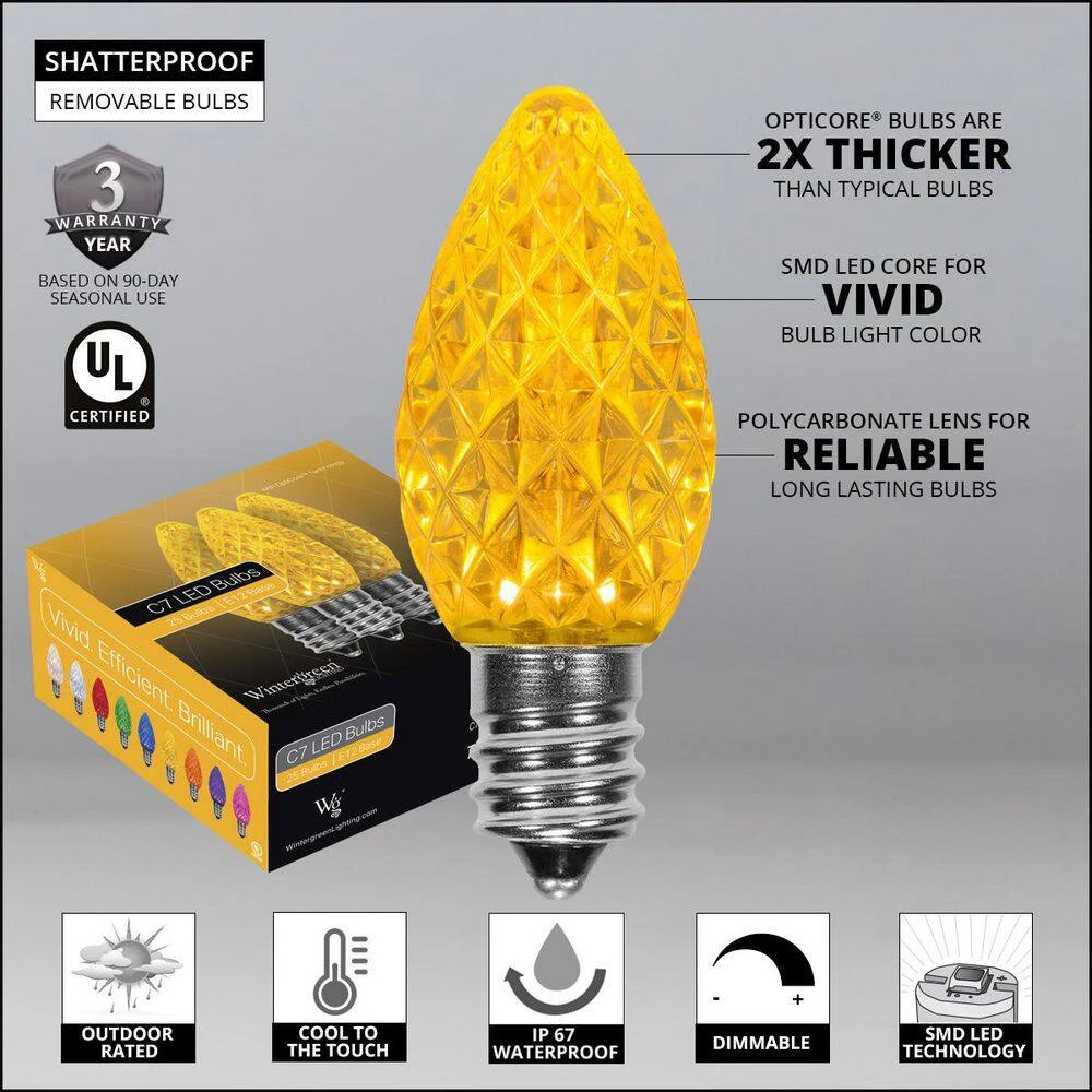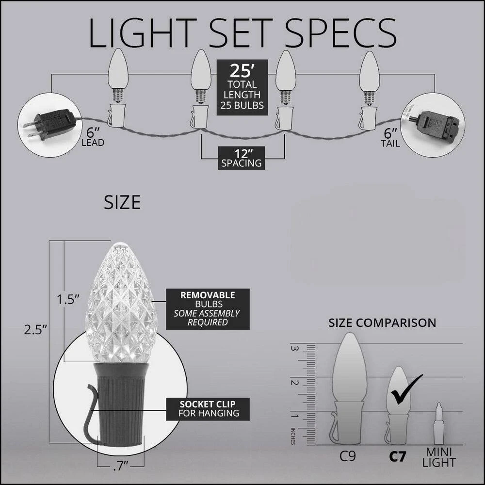 - 25 OptiCore C7 gold LED bulbs and one 25 ft. green E12 stringer with sockets spaced 12 in. apart, 6 in. leads with fused polarized male plugs, 6 in. tails with female plugs for end to end connections, 25 ft. total light kit length, to assemble, simply twist bulbs into sockets